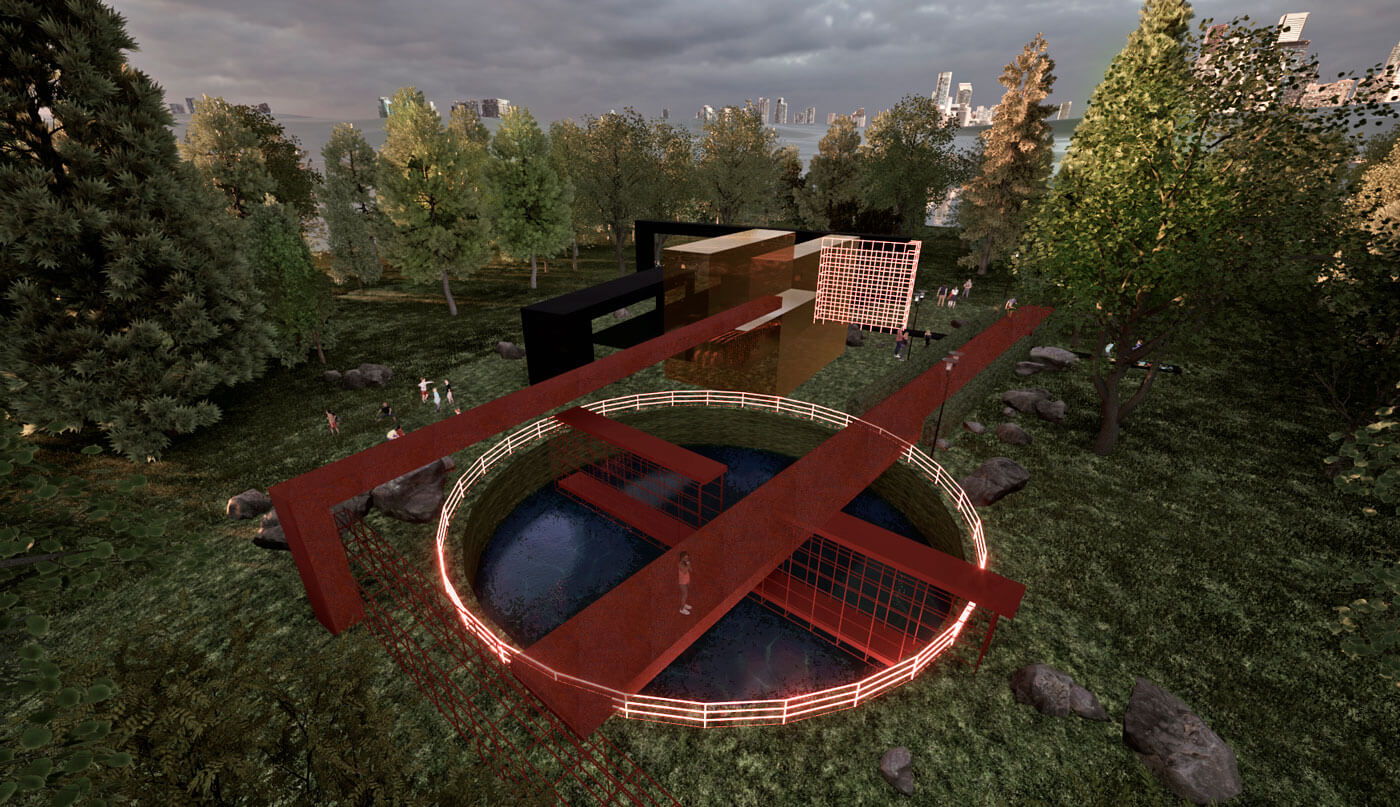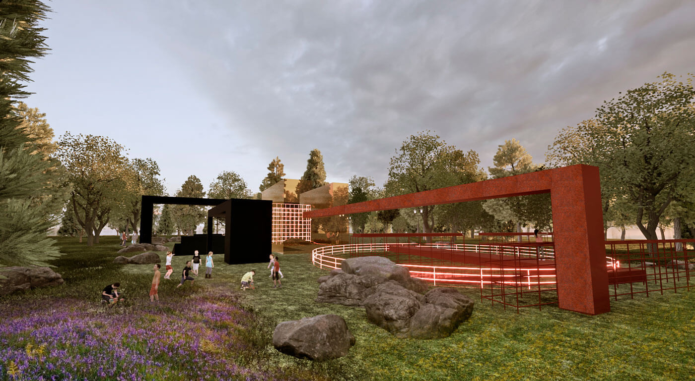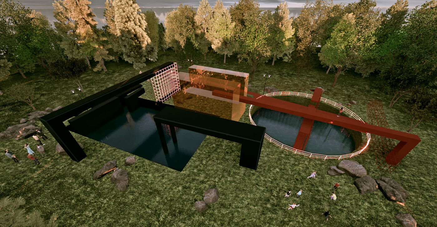 Проект организации площадки в парковом пространстве был выполнен под впечатлением работ Казимира Малевича. За основу был взят супрематический рисунок, «выращенный» нами в объем.