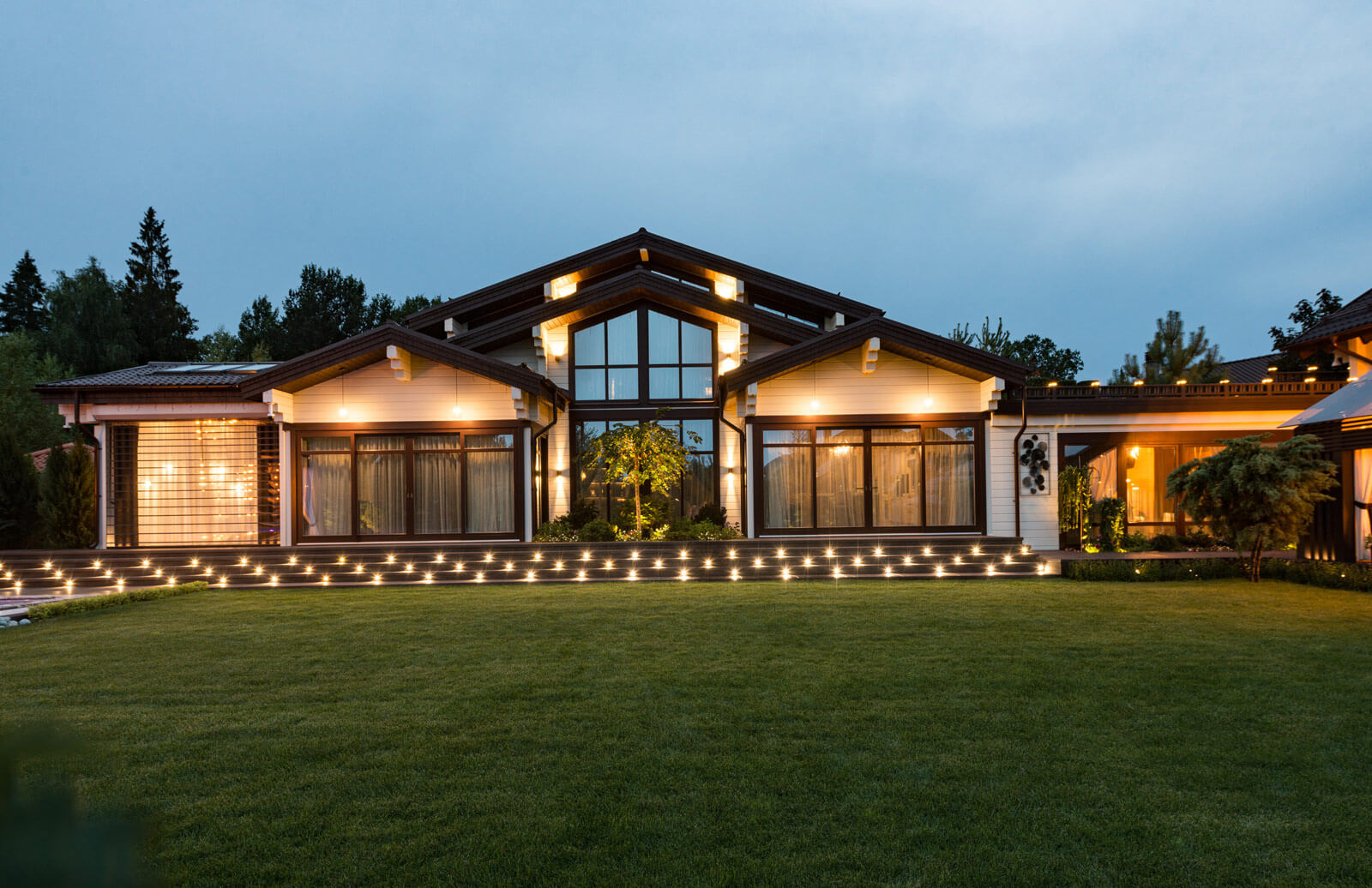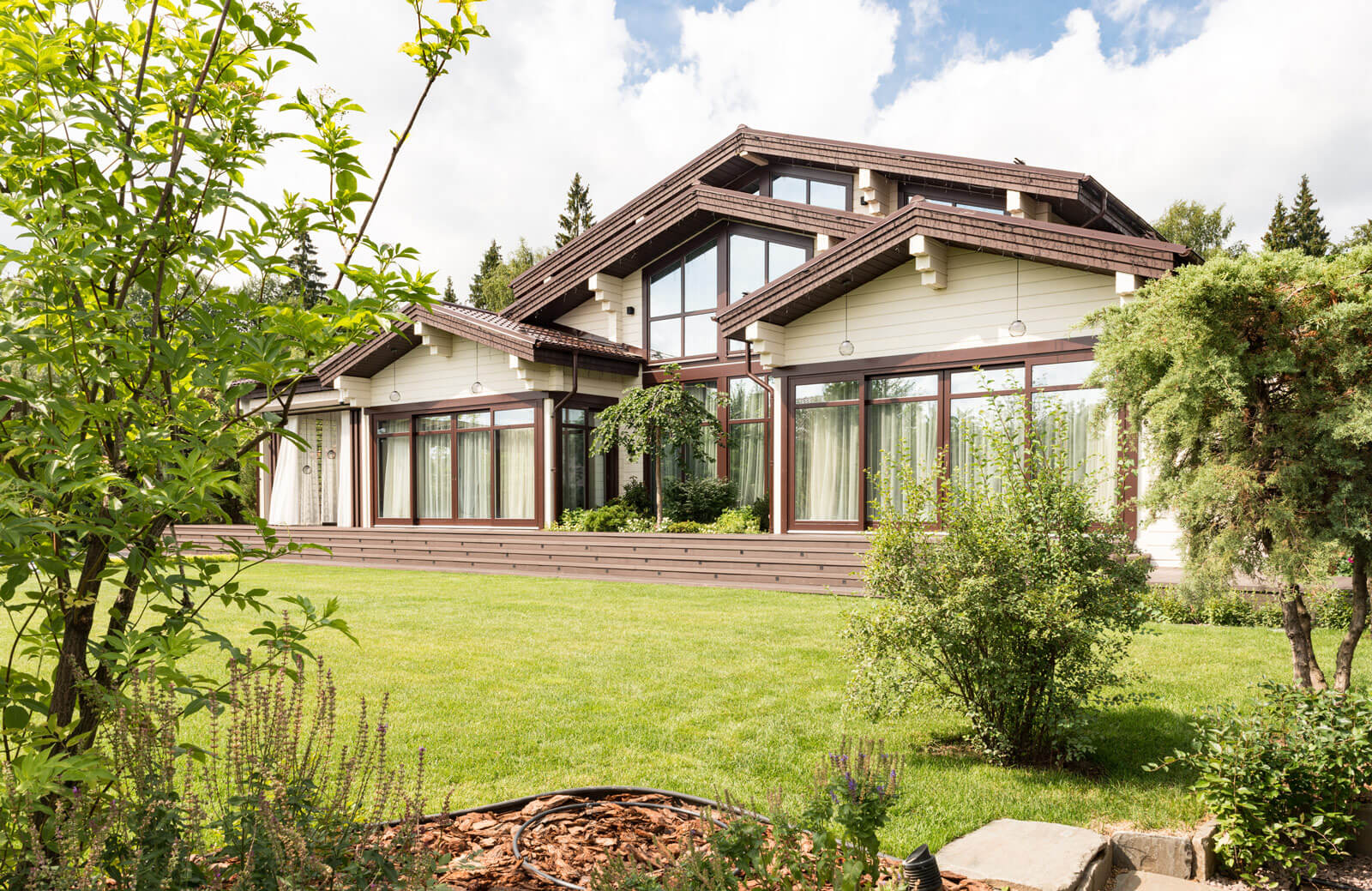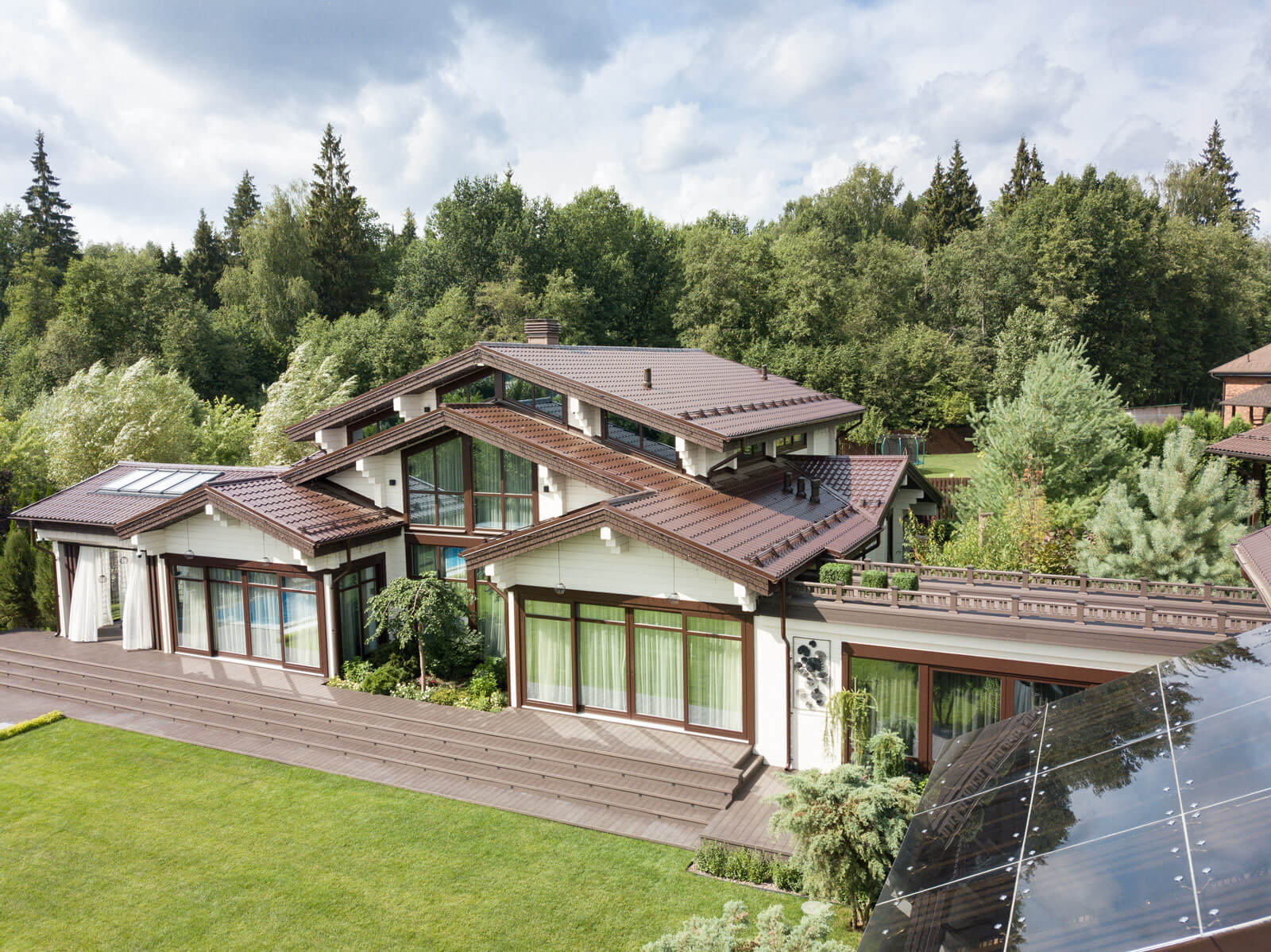 Материал стен — клееный брус, сосна. Кровля — металлочерепица. Мансардные окна в топовой комплектации. Окна — деревянные, включая порталы.