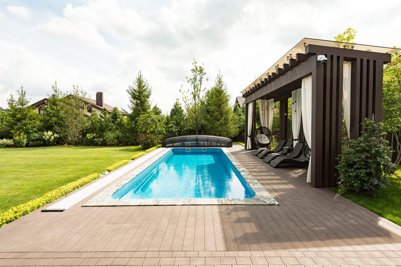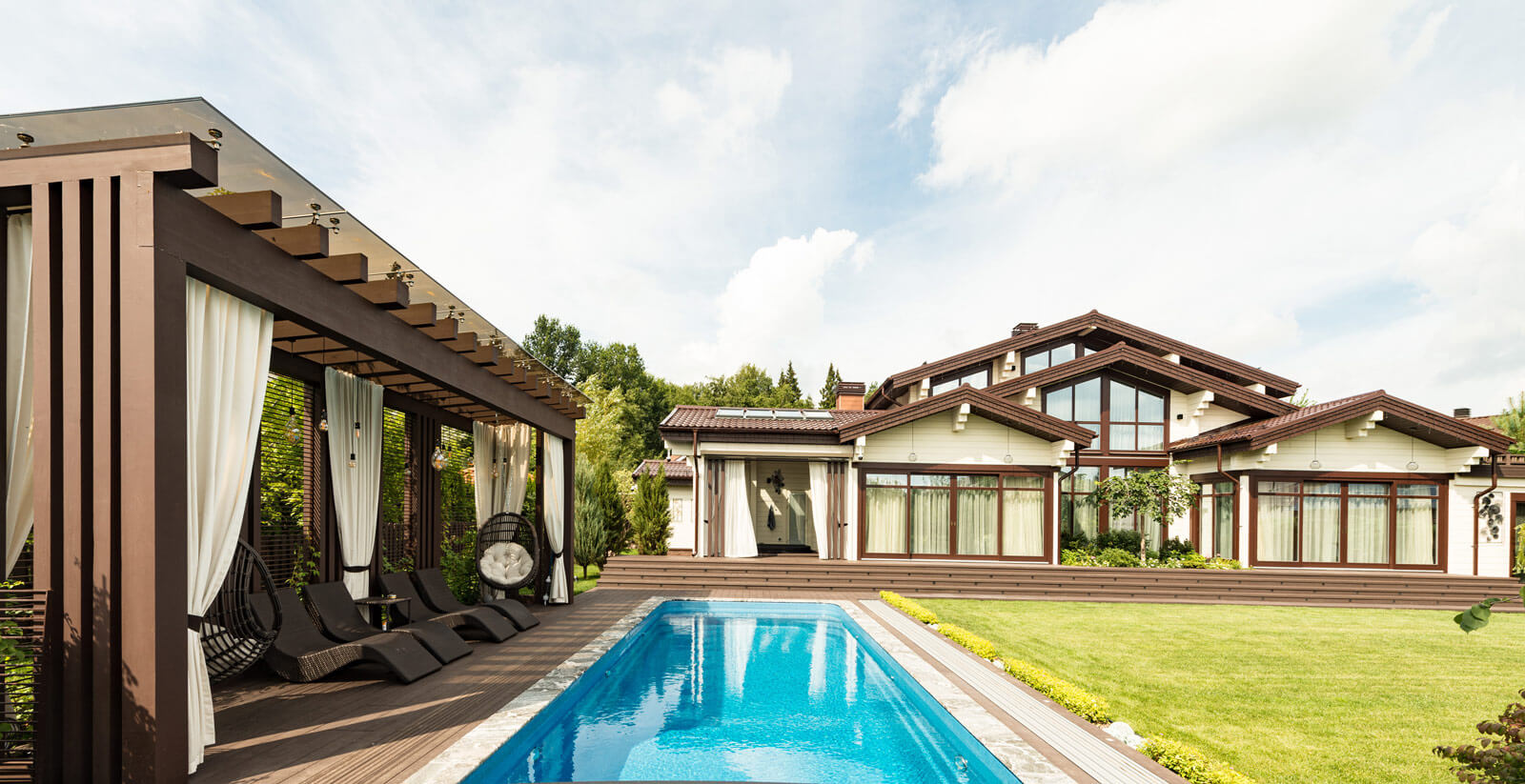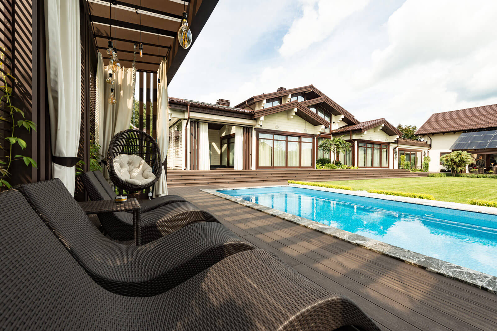 На террасе расположены джакузи с подогревом воды и бассейн, в которые попадаем через проходную комнату отдыха с диванами. Теплыми вечерами можно будет открывать раздвижные двери по двум стенам, с которых открывается прекрасный вид как на бассейн, так и на весь участок дома.