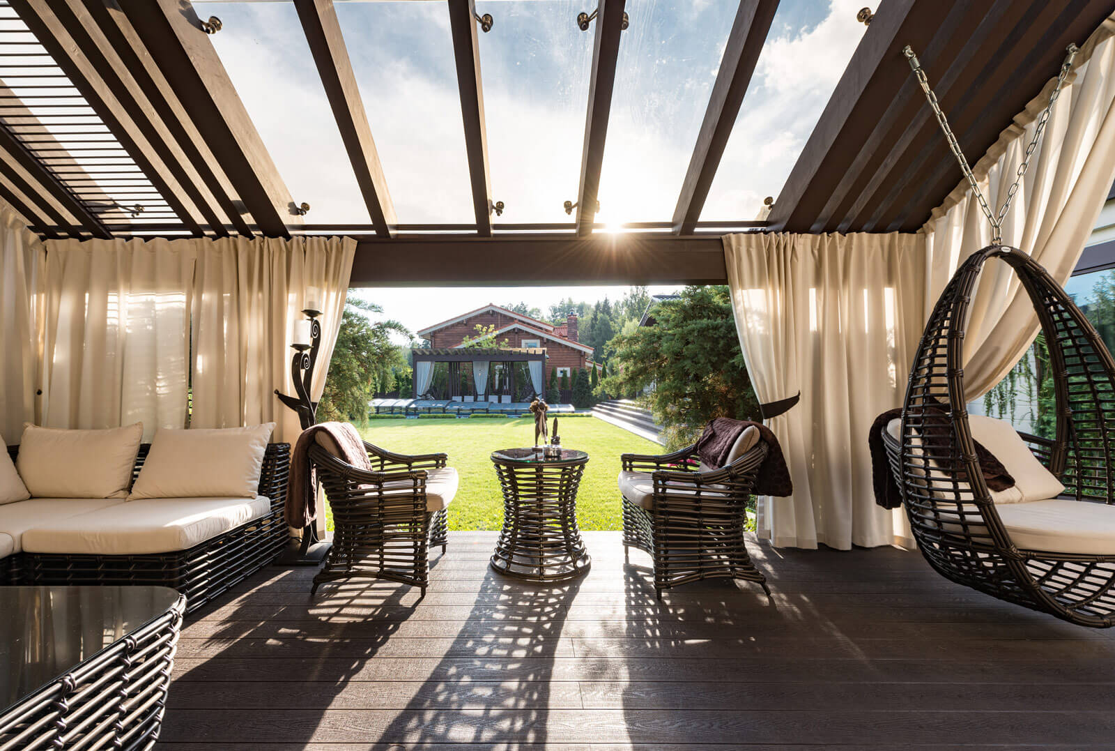 На участке в общей стилистике планировалось сделать остекленные навесы, добавить открытую террасу перед существующим домом. Галерею — переход сделать эксплуатируемой в летнее время года.