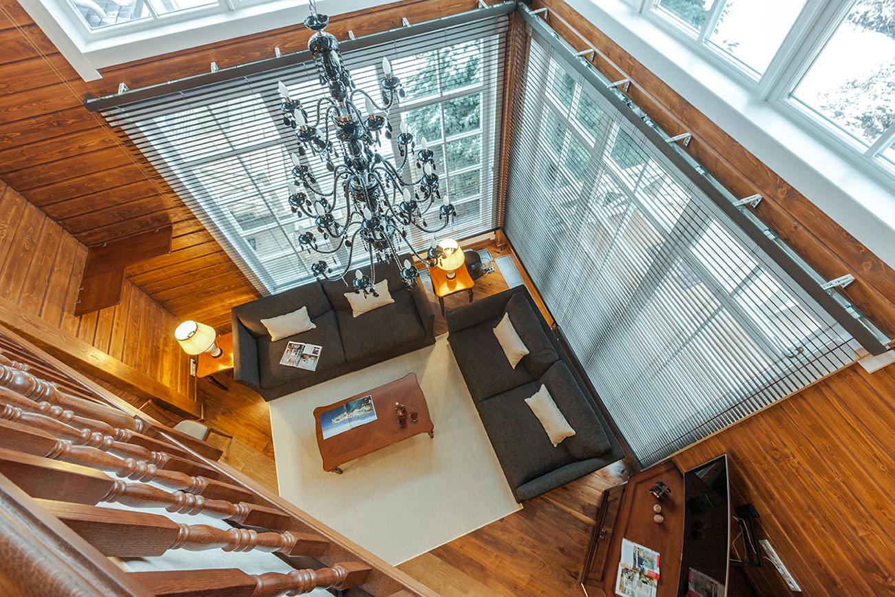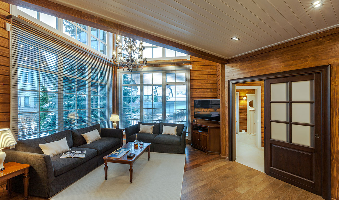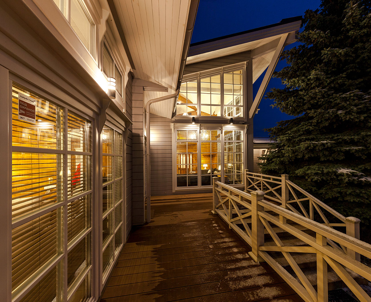 Сквозь окна дарит вид на хвойных он прелестниц.
