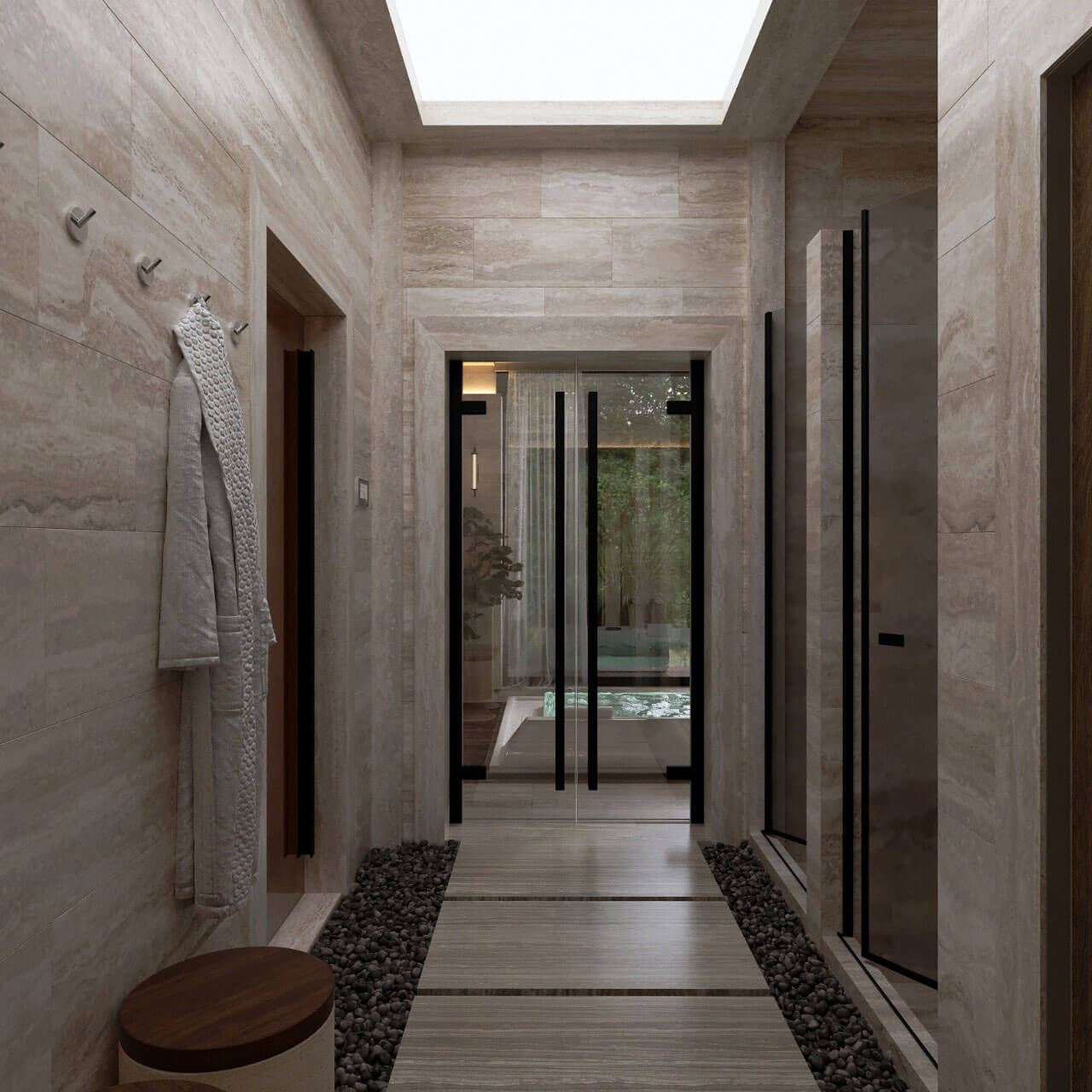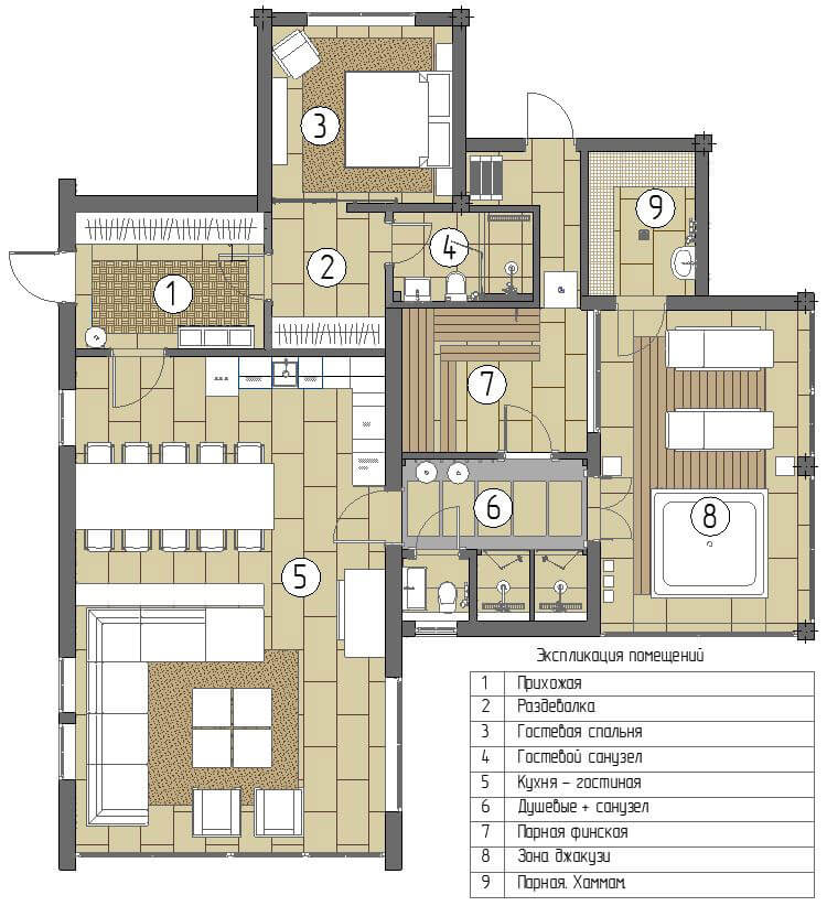 Заказчик обратился к дизайнеру по рекомендации своего лучшего друга, для которого дизайнер спроектировал интерьер жилого дома. Сам объект, над разработкой которого предстояло потрудиться, оказался не совсем типичным. Это дом отдыха со spa зоной на территории основного дома. И если с дизайном основного дома у заказчика не возникало особых вопросов, то данный проект стал для него камнем преткновения с точки зрения дизайн-концепции. С одной стороны данная постройка должна была быть местом умиротворения и отдыха, однако, и удивить многочисленных гостей заказчику хотелось не меньше, чем погрузиться в атмосферу релакса. А стилистические предпочтения и вовсе колебались от минимализма до классического альпийского шале.
