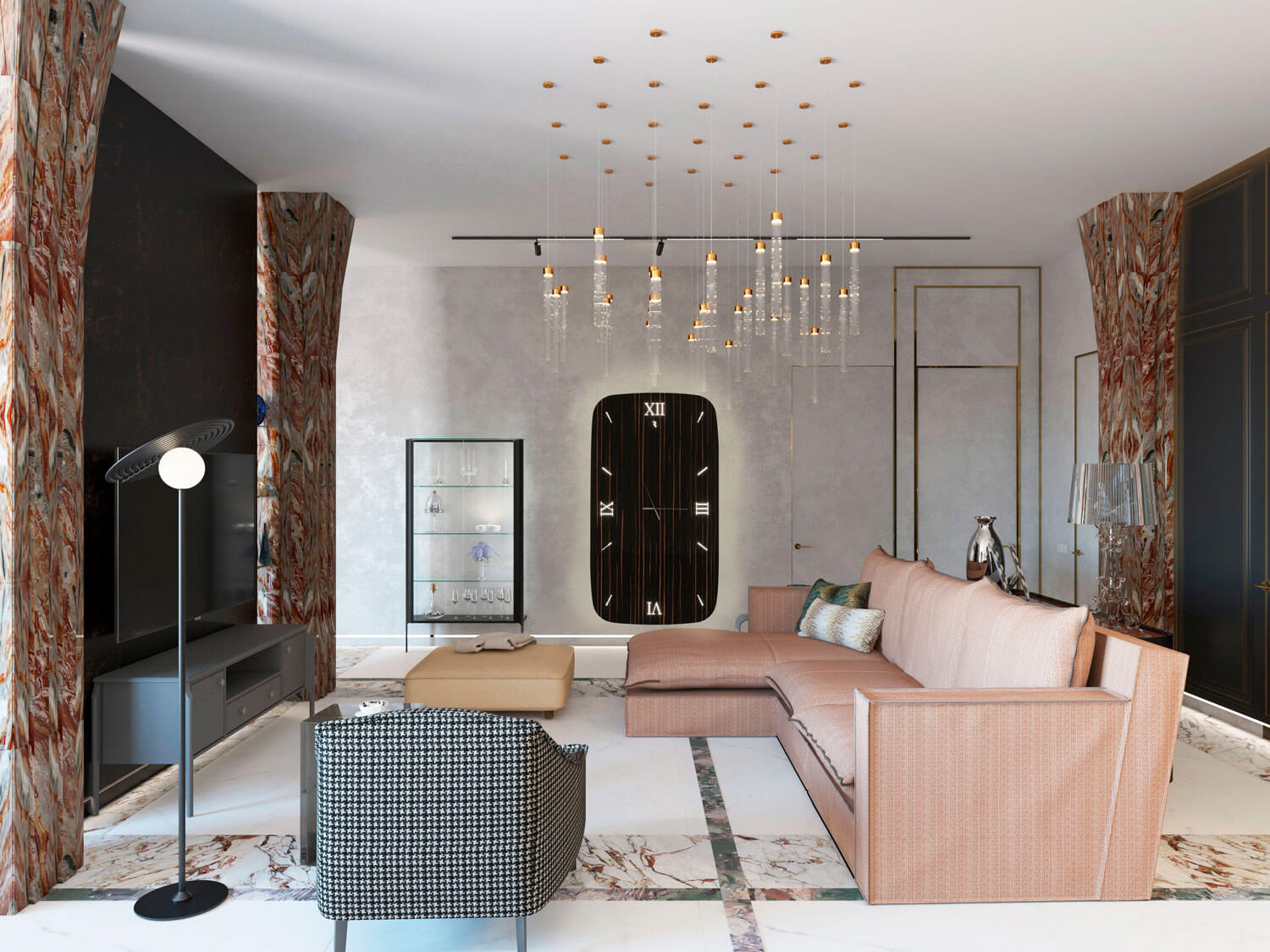 Изначально в основном пространстве кухни-гостиной уже были две колонны. Автор же предложила усилить эффект: углубить ненесущую стену в сторону санузлов, выявив пилястры, добавить зеркально относительно оси гостиной две колонны, чтобы подчеркнуть образовавшийся перистиль. Вдохновением для создания отделки колонн послужили существующие экспонаты на московской станции метро.