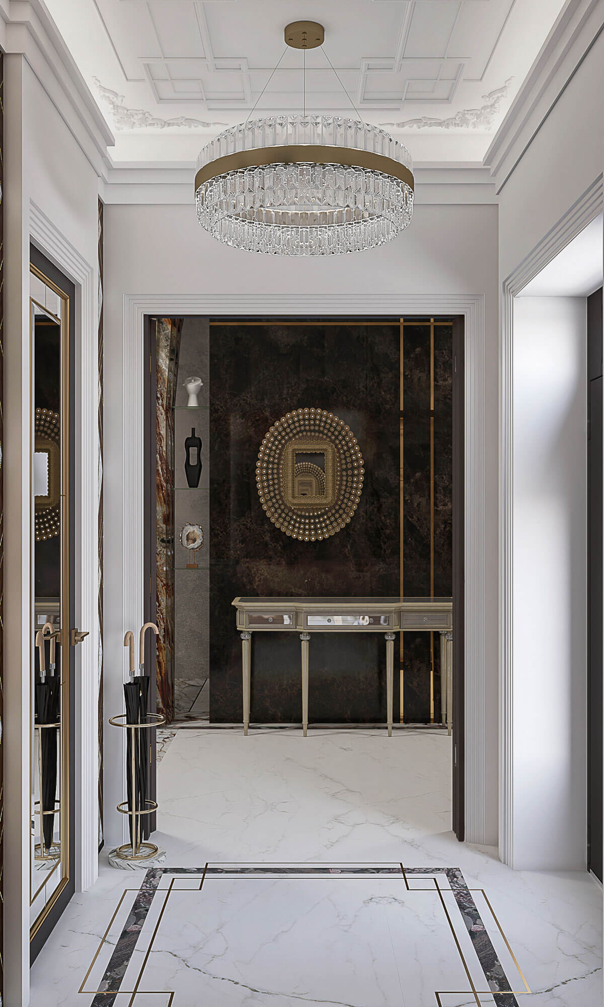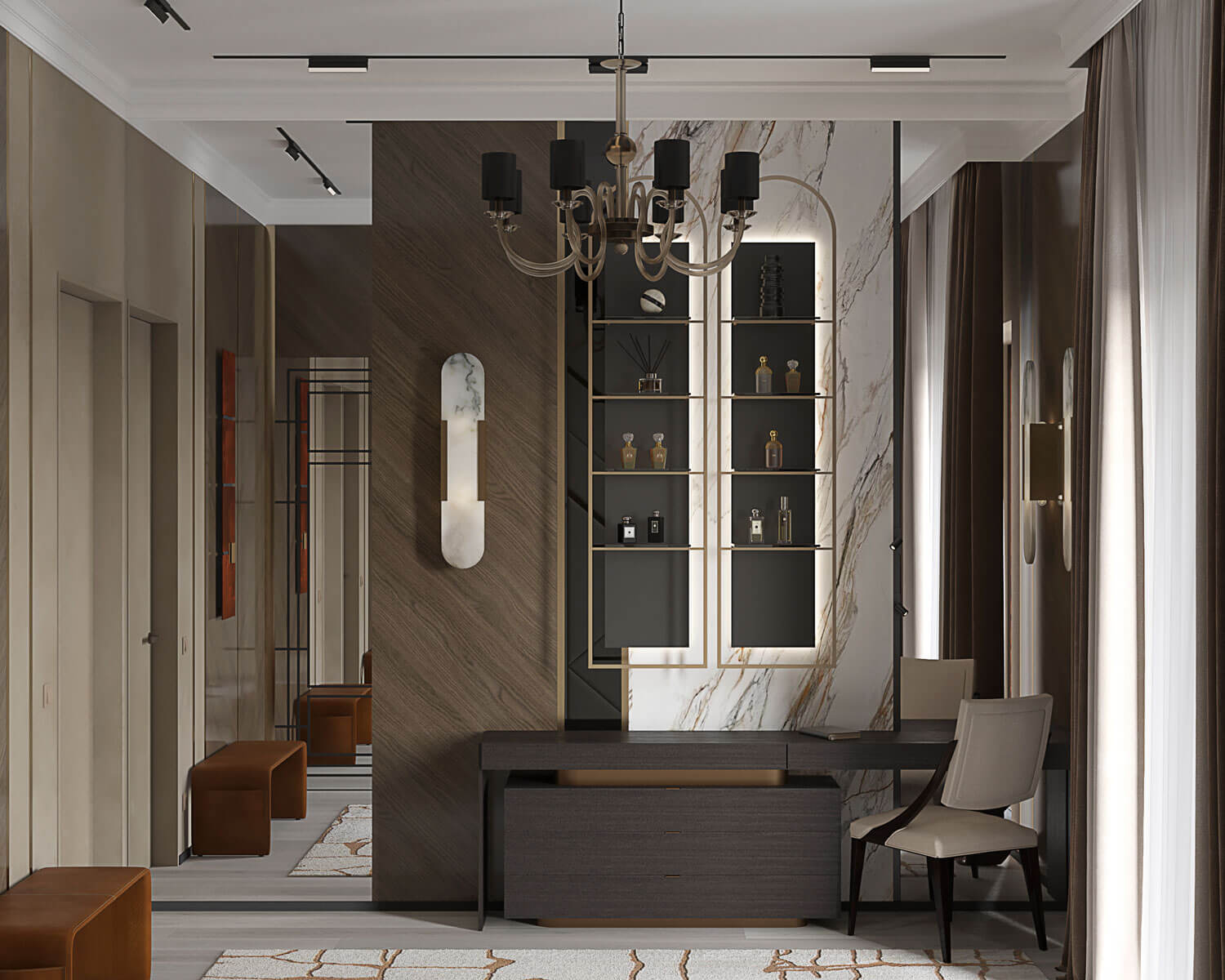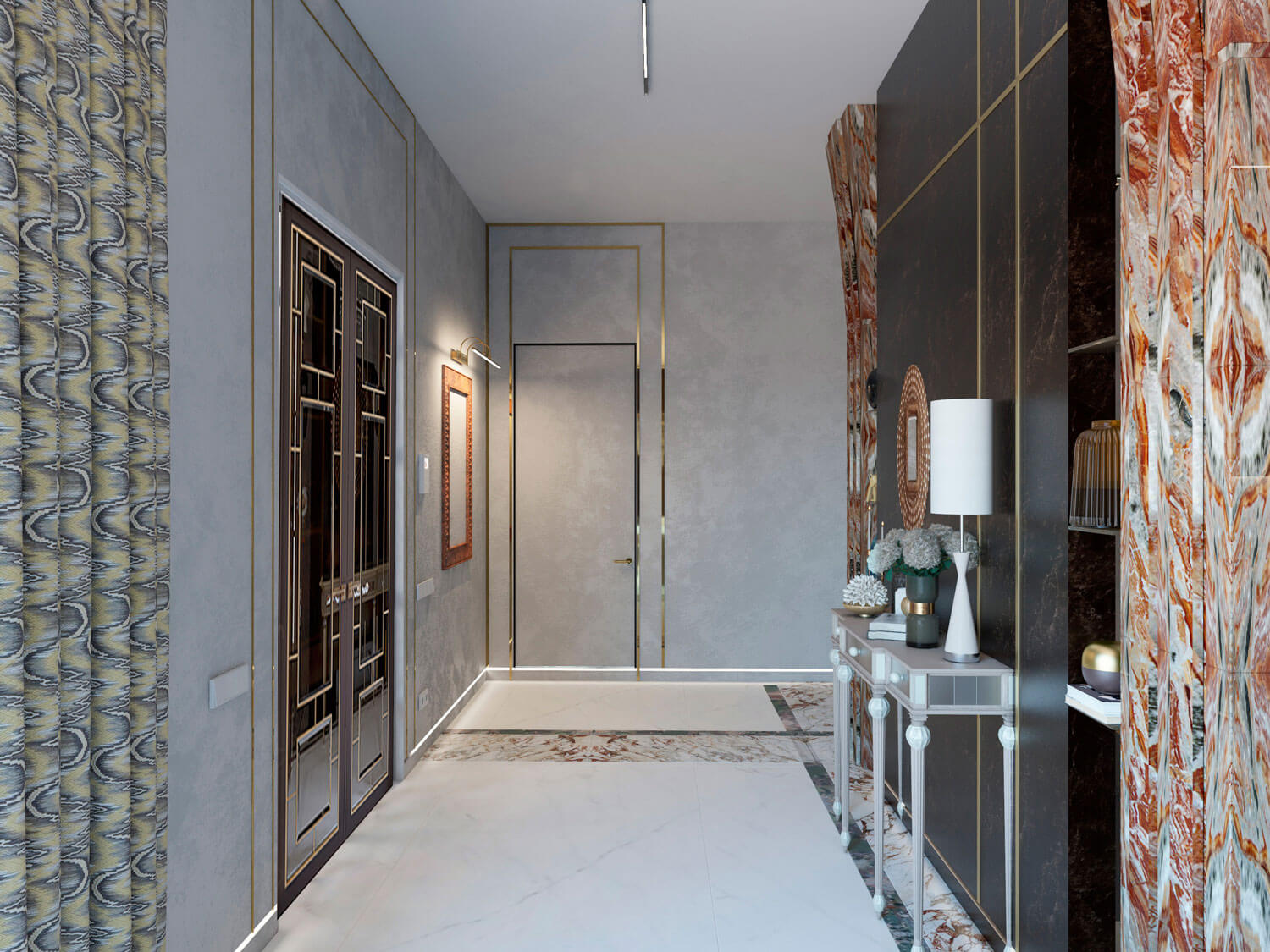 Супружеская пара средних лет обратилась с просьбой создать респектабельное пространство их дома. Заказчик любит камень в любом его проявлении. Поэтому в основу проекта легла идея метро, где камень представлен во всем своем многообразии и великолепии. Так же заказчики оказались ценителями искусства, поэтому сразу были предусмотрены места для картин и скульптур, которые впоследствии появятся. Отсюда и название проекта – Проспект Просвещения как называется одноименная станция метро в Санкт-Петербурге.