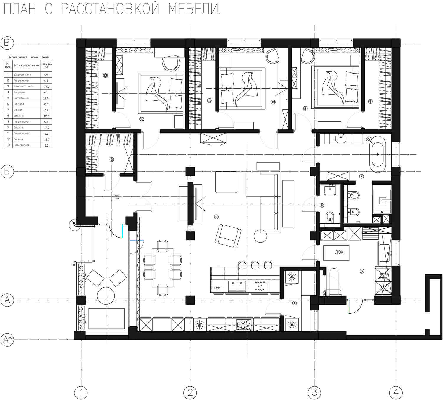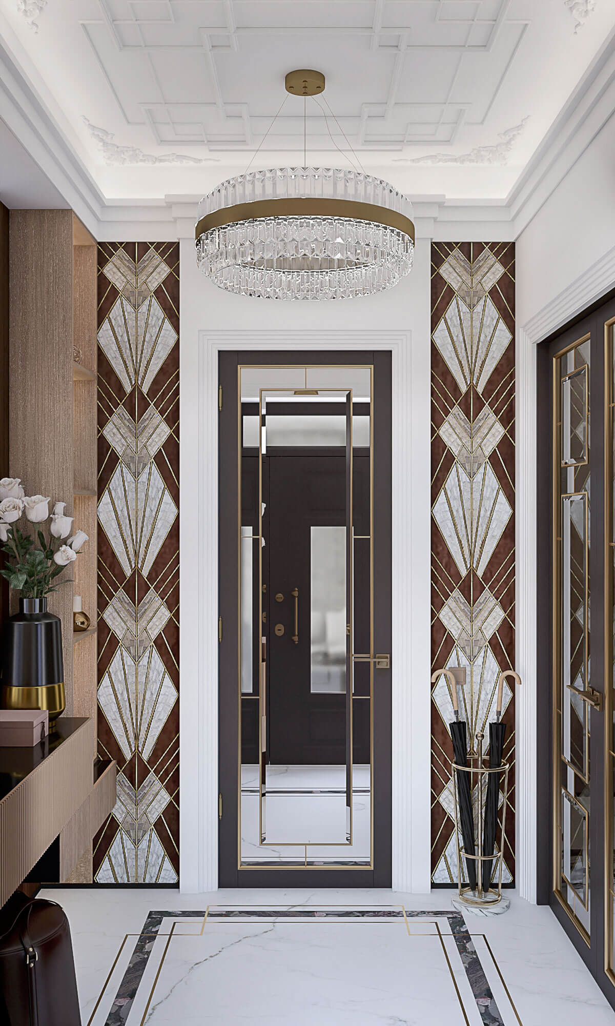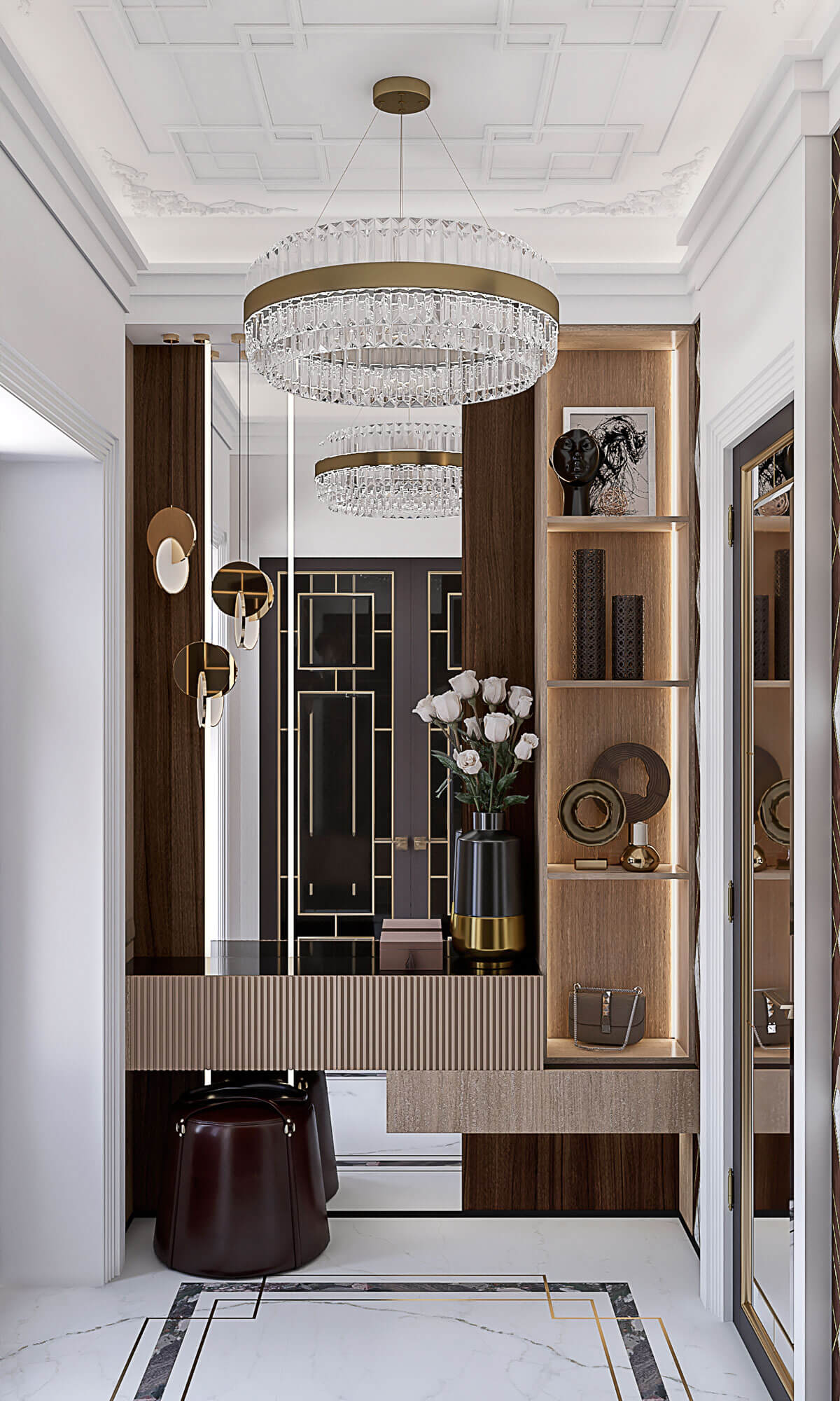 Супружеская пара средних лет обратилась с просьбой создать респектабельное пространство их дома. Заказчик любит камень в любом его проявлении. Поэтому в основу проекта легла идея метро, где камень представлен во всем своем многообразии и великолепии. Так же заказчики оказались ценителями искусства, поэтому сразу были предусмотрены места для картин и скульптур, которые впоследствии появятся. Отсюда и название проекта – Проспект Просвещения как называется одноименная станция метро в Санкт-Петербурге.