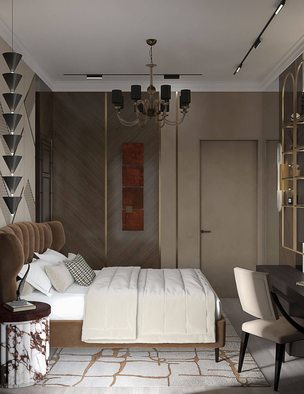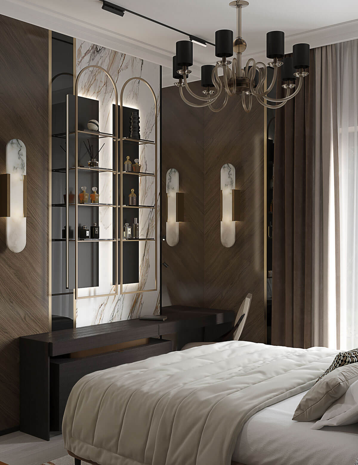 В спальне заказчика камень фигурирует не только на стенах, но также используется в отделке светильников и мебели.