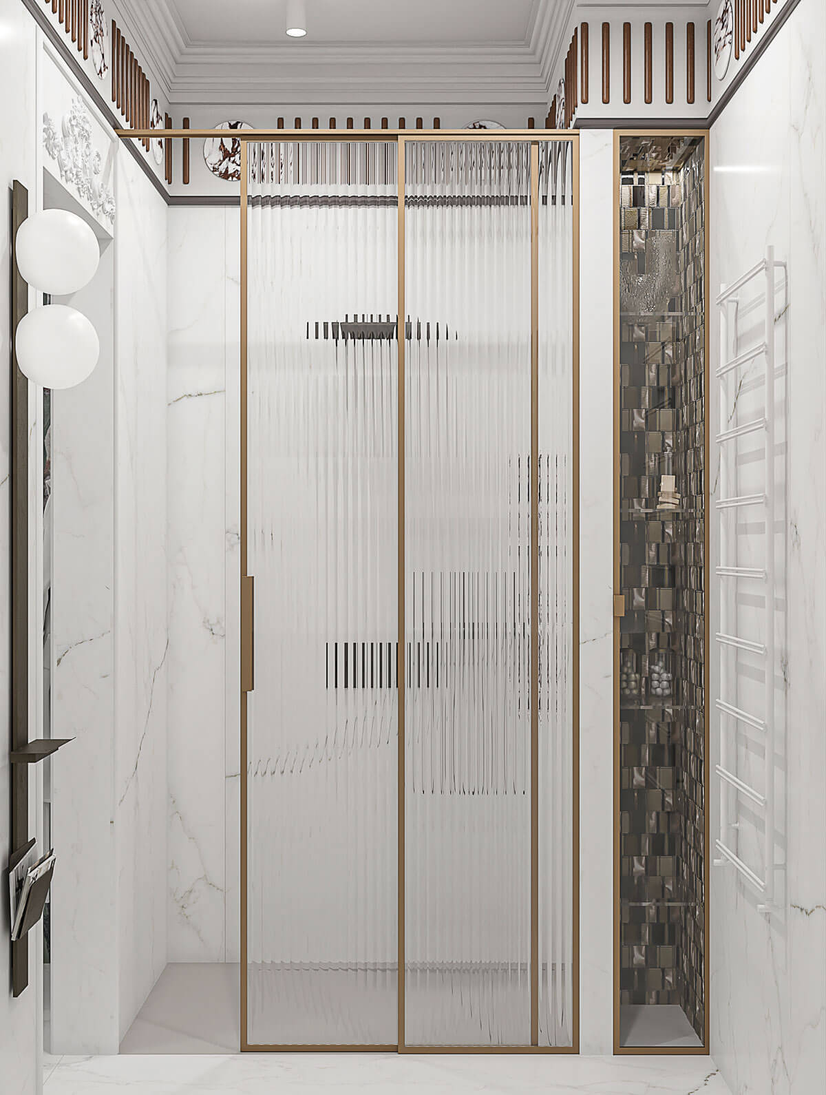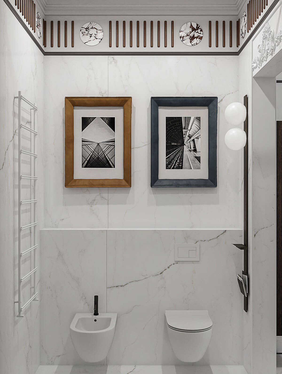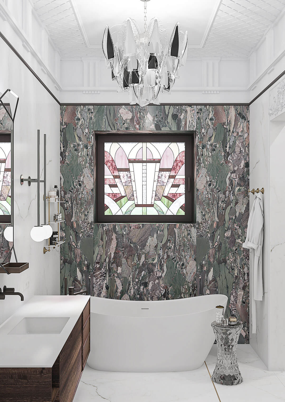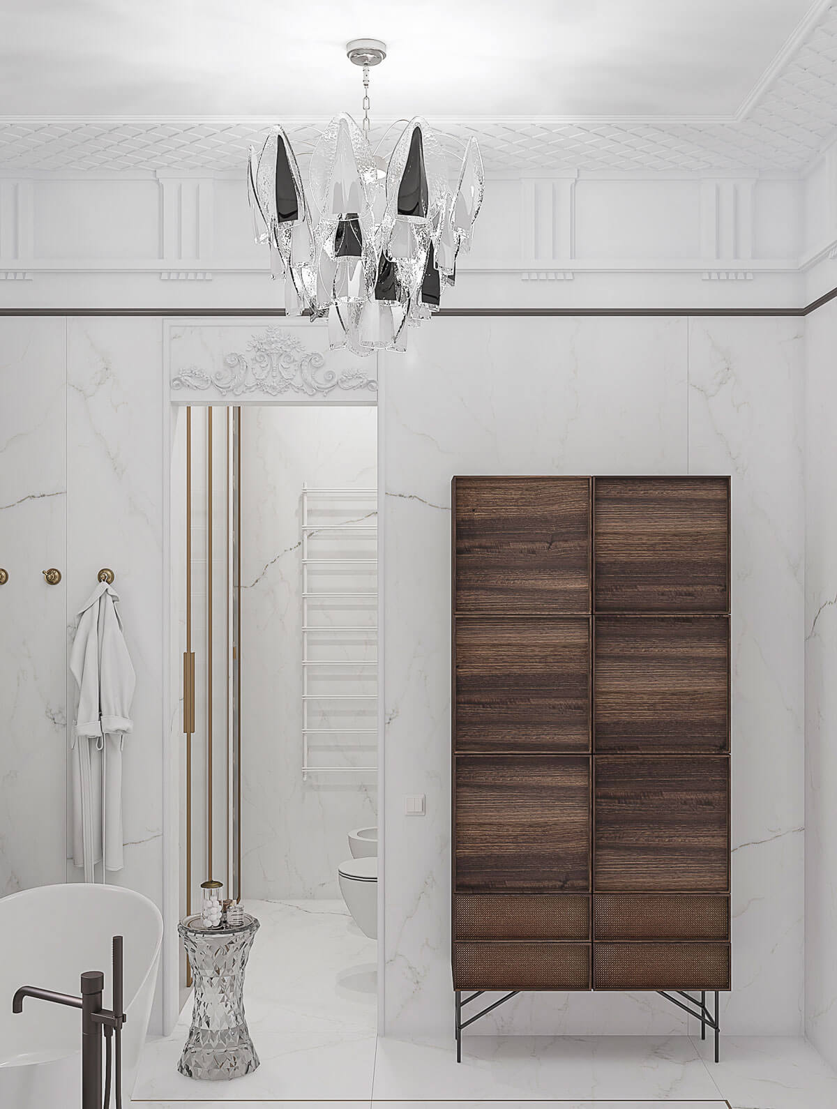 Отделка камнем предусмотрена не только на колоннах гостиной. Стены ванной комнаты также украшены слебами мрамора калакатта и гипсовой лепниной.