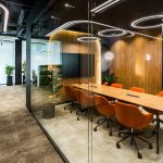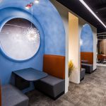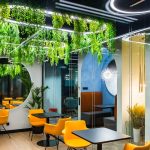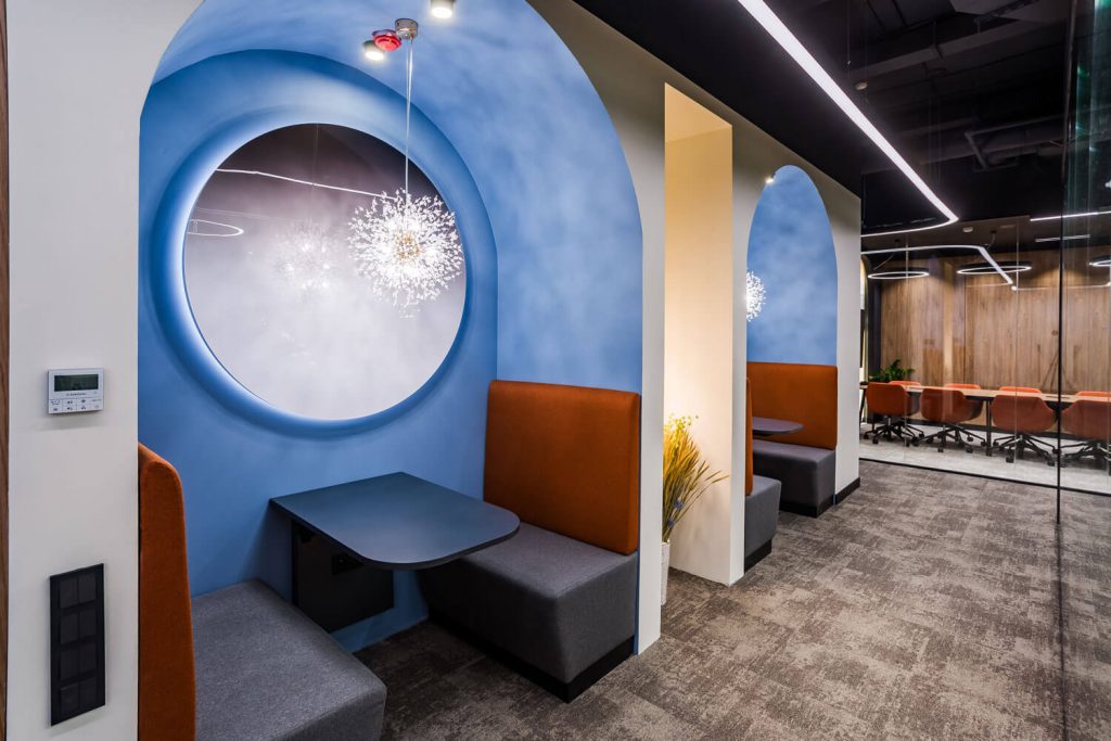 Главная геометрическая фигура интерьера — круг: настенные декоративные элементы с подсветкой, скругленные детали мебели, освещение. Яркие акценты архитектор показал с помощью разнообразной ткани для мебели, необычных оттенков, выбранных для стен, и, конечно же, озеленения офиса.