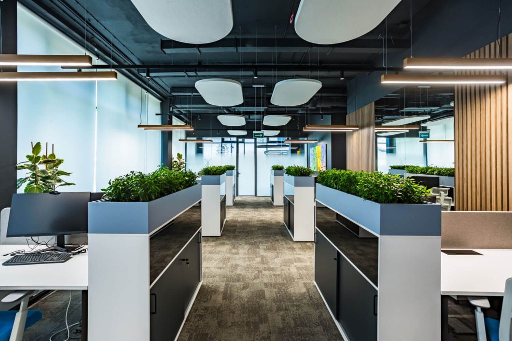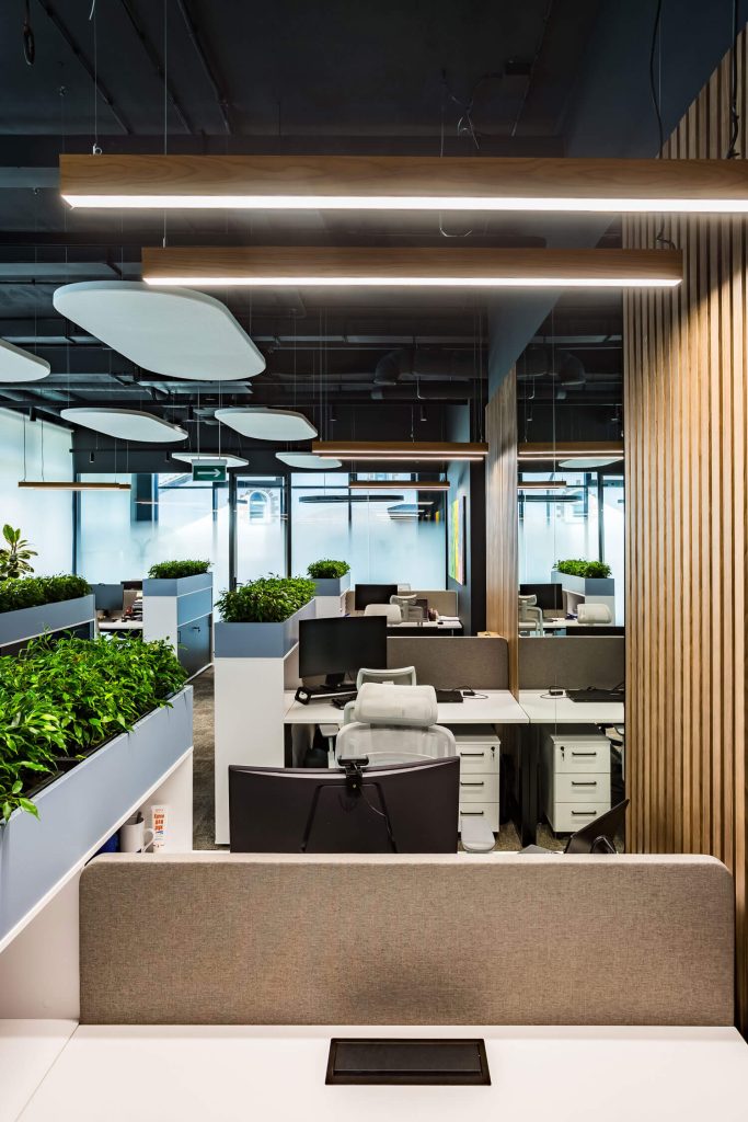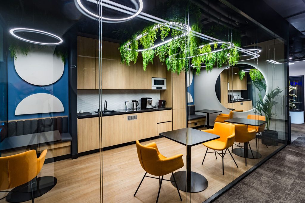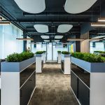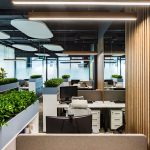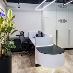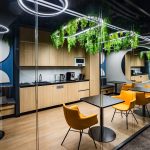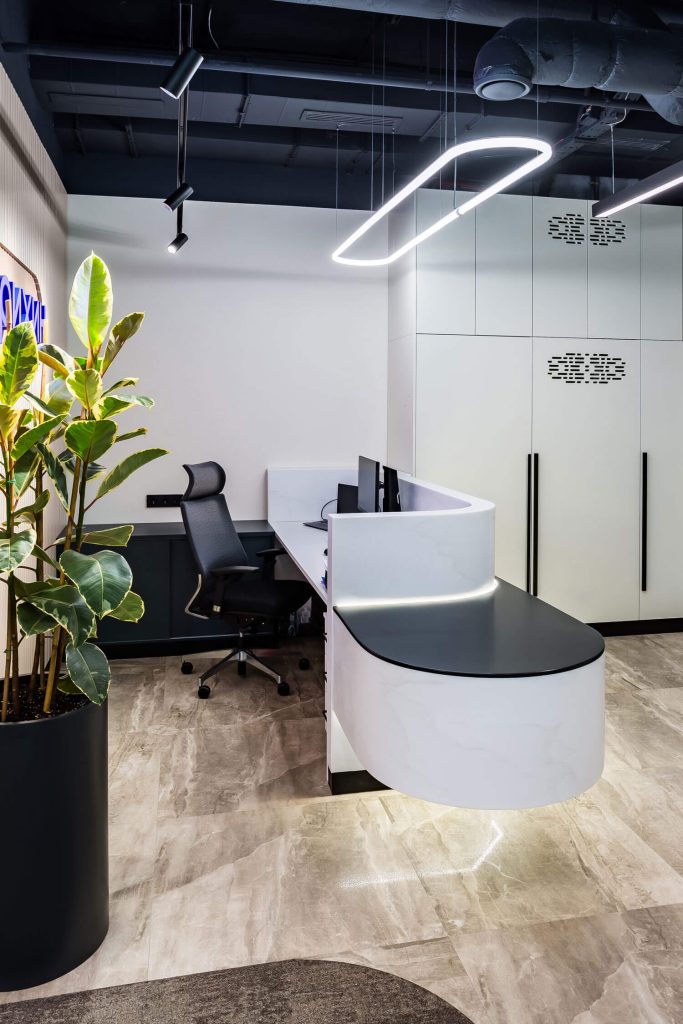 Перед архитектором была поставлена задача создать новое современное пространство для успешной фармацевтической компании. На 250 м2 удалось разместить 16 рабочих мест, два кабинета, две переговорные комнаты, зону отдыха и закрытую кухню. Использование зеркал помогло расширить пространство визуально и наполнить его дополнительным светом. Благодаря комбинации светлого дерева и брутальных темных оттенков, которые изначально присутствовали в интерьере бизнес-центра, а также теплых тонов напольной плитки, удалось создать современный и уютный офис. Главным центром притяжения стала релакс-зона для сотрудников, уютная и располагающая к отдыху. Ее подчеркнули проемами круглых арок с акцентными элементами. Между ними установлены флористические композиции. В офисе много зелени: большие фикусы и драцены в напольных кашпо, рабочие столы отделены друг от друга приставными тумбами с пышной растительностью, даже люстры декорированы спускающимися вниз растениями. Это решение — реализация ключевого замысла архитектора: природа, объединяющая пространство.