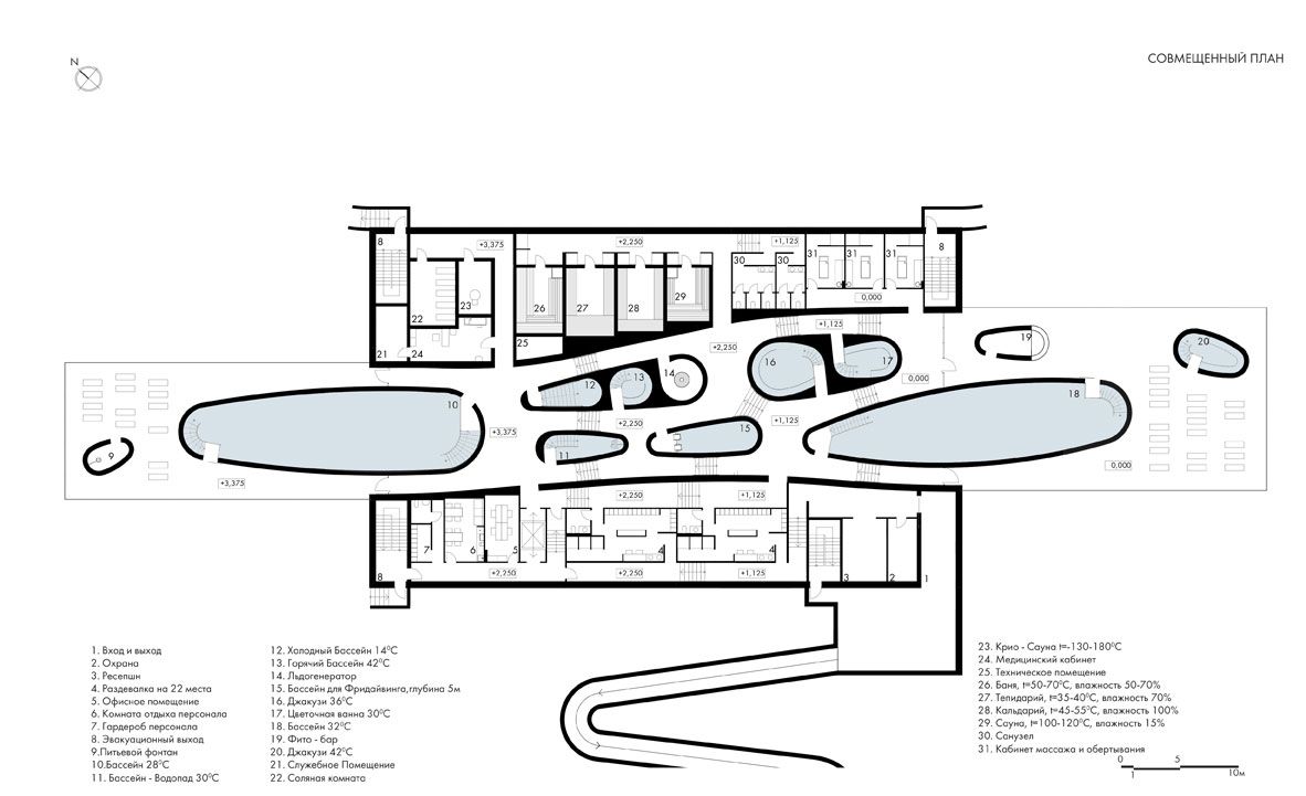 Банно-термальный комплекс включает кабинеты массажа и обертывания. От посещения разных парных гости получат комбинированные ощущения. Также в проекте есть криосауна, соляная комната и медицинский кабинет.