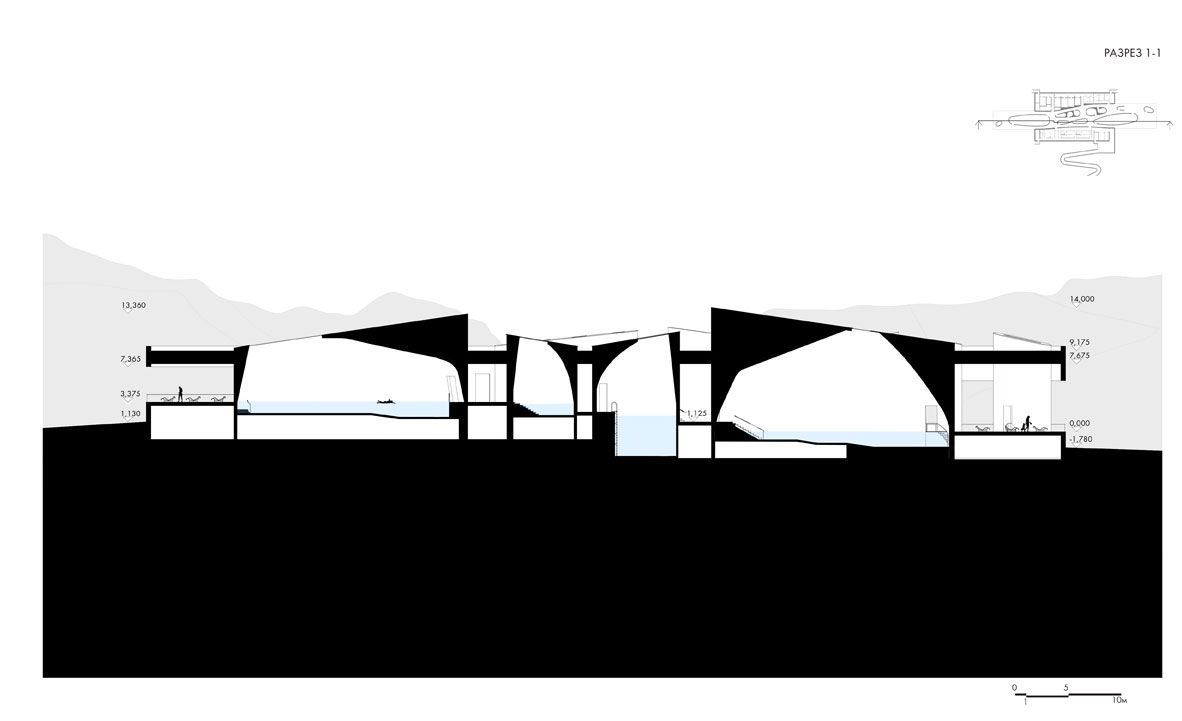 «Проток» — это 11 бассейнов с разной температурой, глубиной и вызываемыми чувствами, а также фитобар. «Проток» завершается террасами с зоной отдыха и медитации. Объемы бассейнов сужаются к верху и завершаются световыми фонарями.