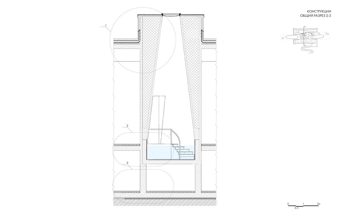 «Проток» — это 11 бассейнов с разной температурой, глубиной и вызываемыми чувствами, а также фитобар. «Проток» завершается террасами с зоной отдыха и медитации. Объемы бассейнов сужаются кверху и завершаются световыми фонарями.