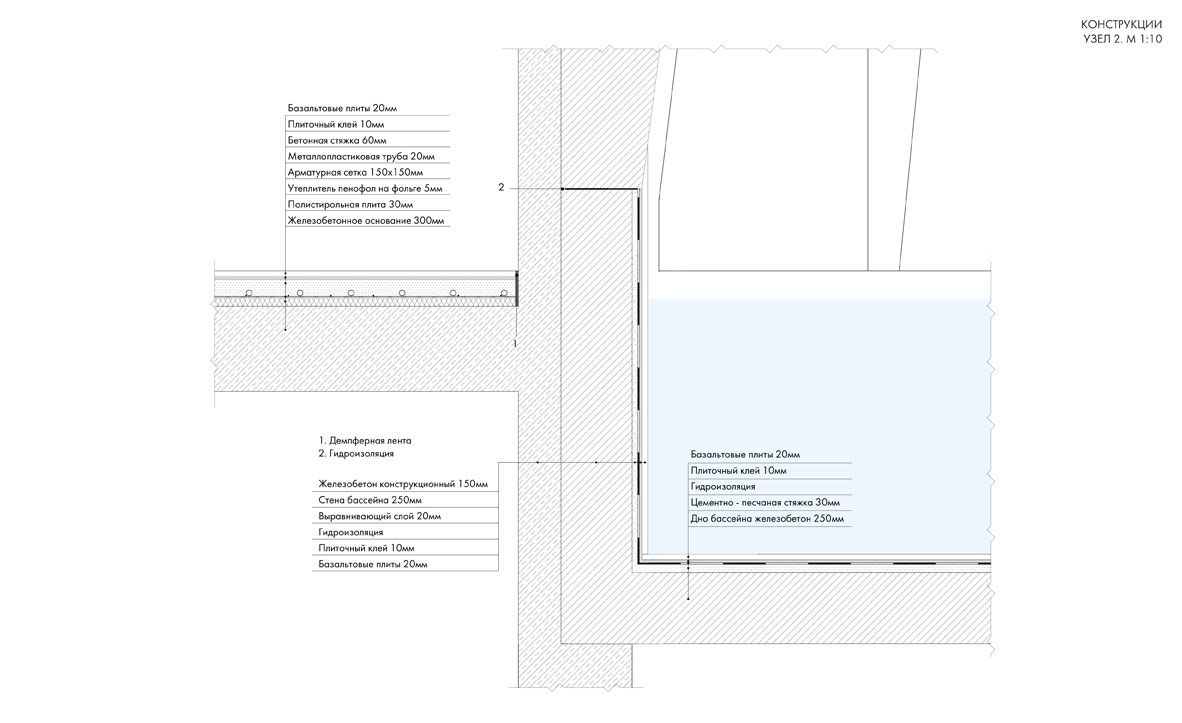 - базальт, местный материал, — для облицовки полов и стен бассейнов;