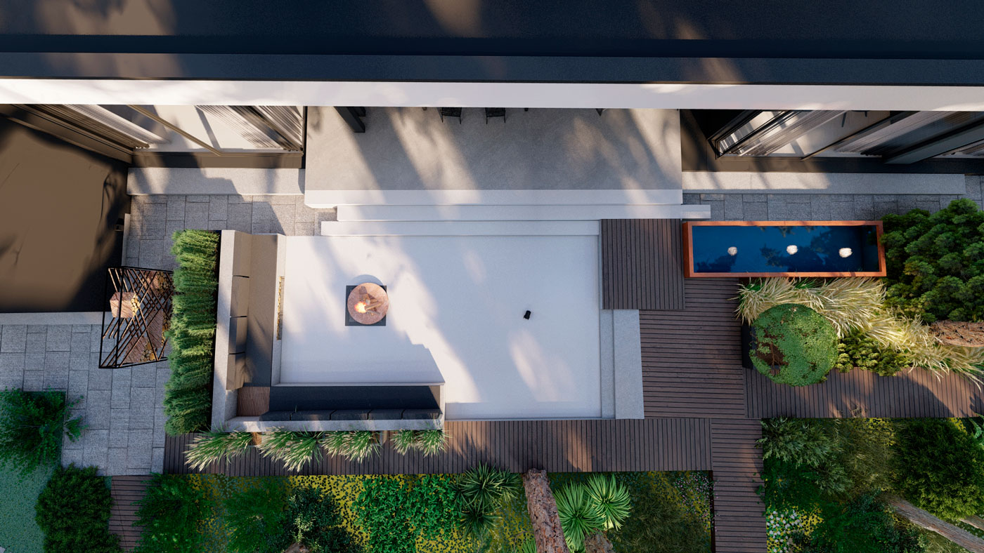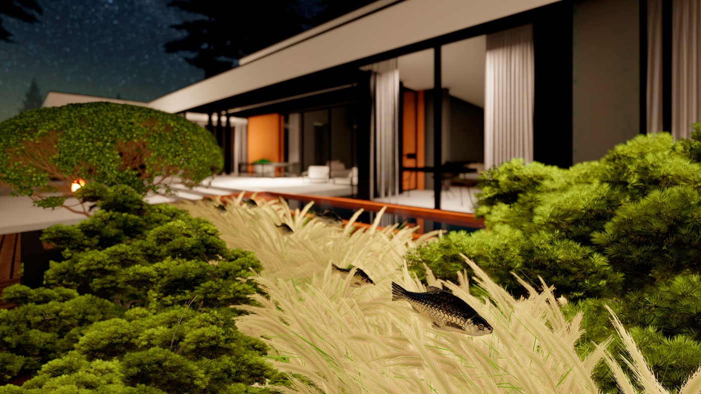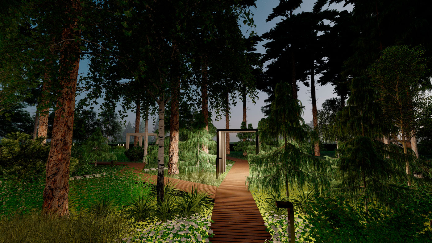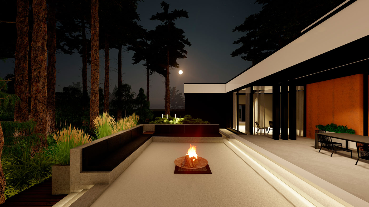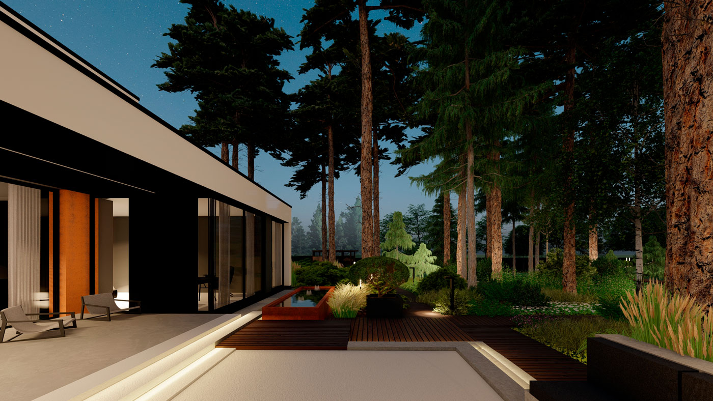 Зона отдыха с очагом у дома решена в стиле минимализма, прекрасно сочетающаяся с архитектурой дома. Окружение дома является цельной композицией, состоящей из графики геометрических форм. Гуляя по саду, мы попадаем в контрастную от дома живописную часть соснового леса. В глубине сада мы ощущаем состояние спокойствия, гармонии, звуки птиц, шелест крон деревьев. Геометрия повторяется в лесной части только в деталях: ломаные формы настила, прямоугольные перголы с подсветкой.