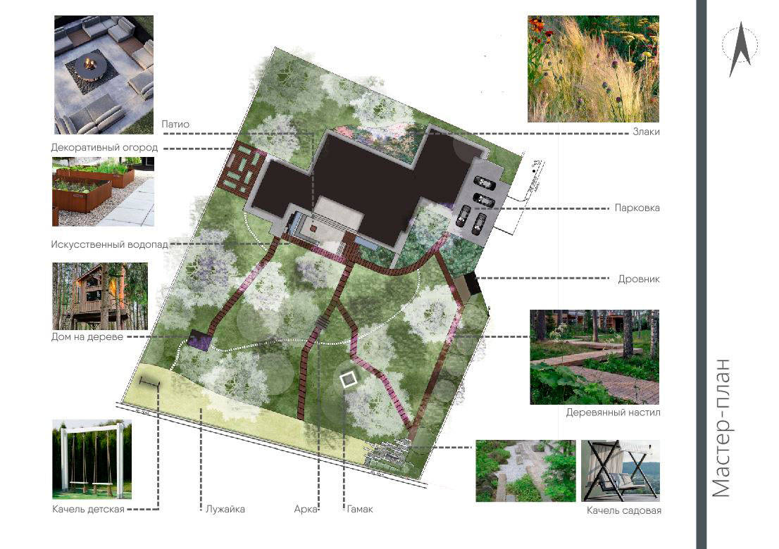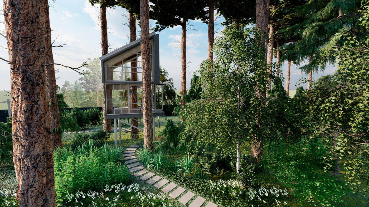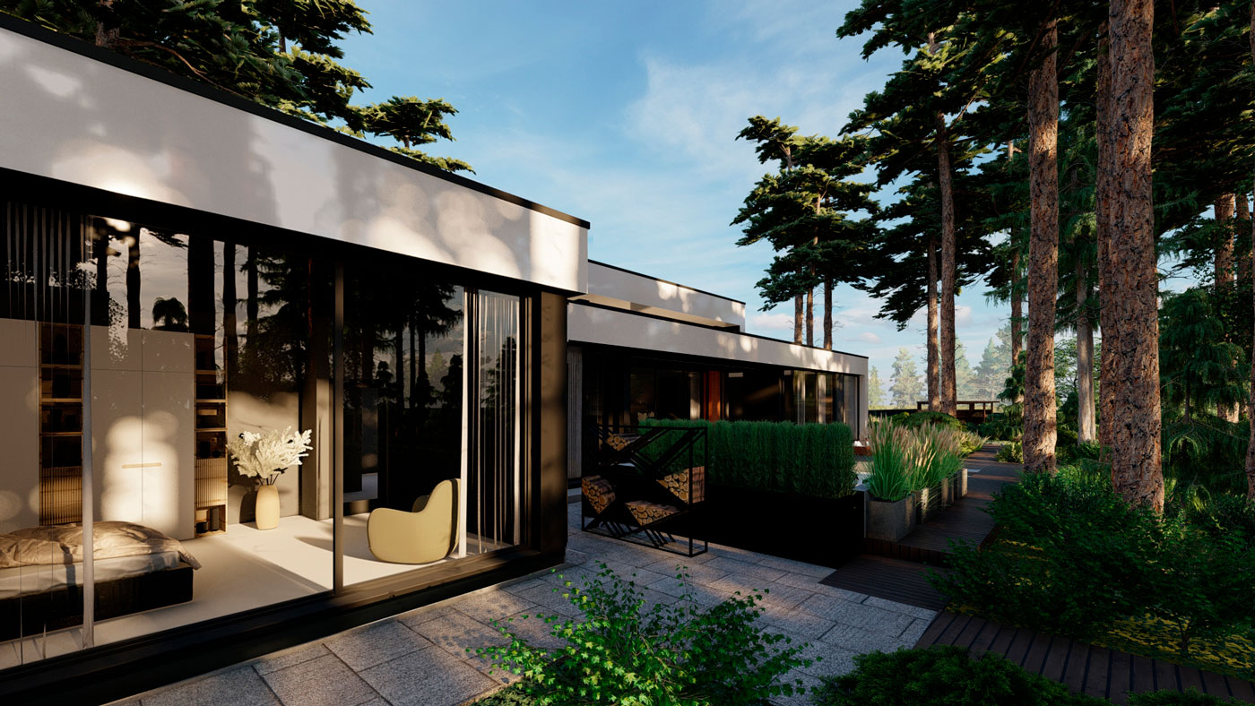 Основа концепции данного проекта — геометрия, современный функциональный стиль архитектуры, гармонично переплетающиеся с лесным природным окружением.
