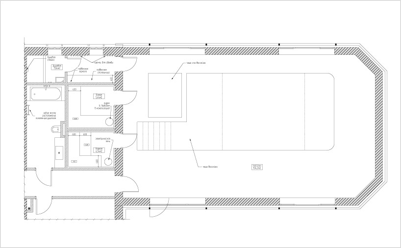 В помещении бассейна планируется также организовать тренажерный зал, поэтому в широкой части зала будут установлены тренажеры.