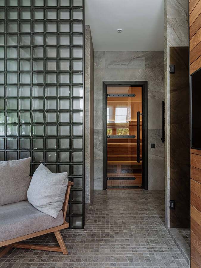 Здесь так же планировалось обустроить небольшую зону Спа - что мы и осуществили, выделив для этого часть помещений первого этажа.