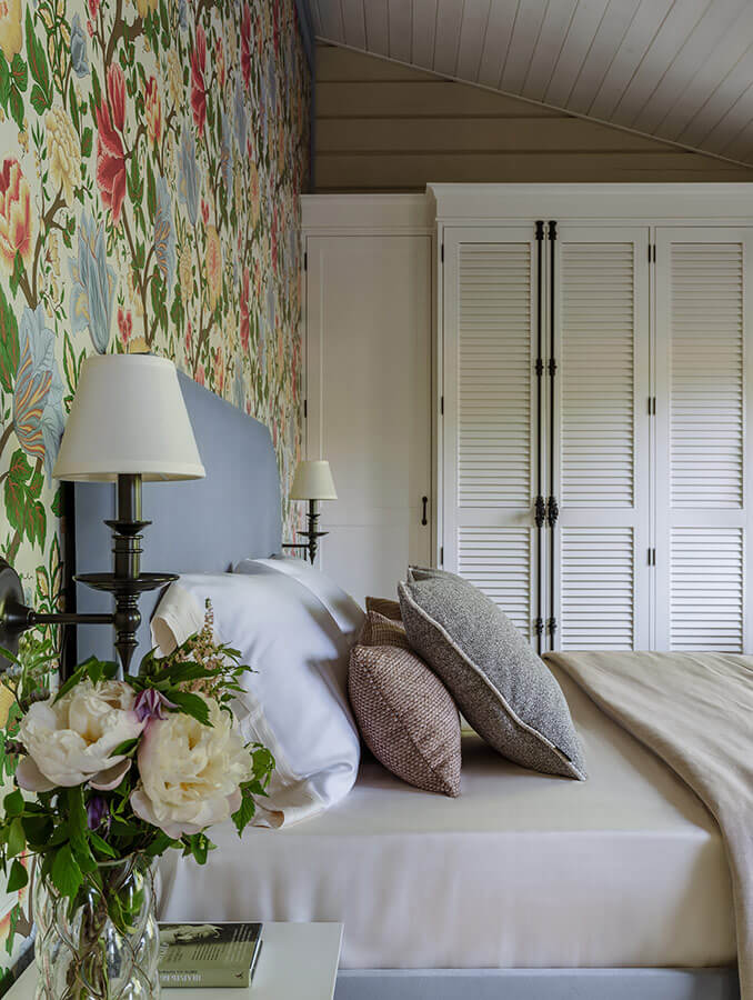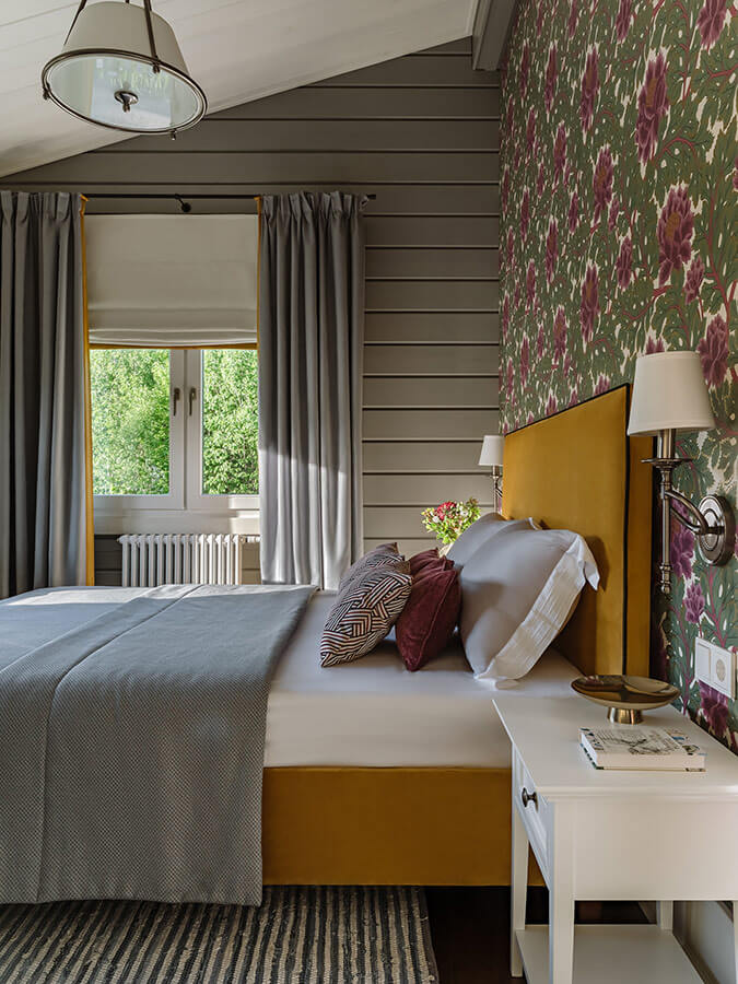 Спальни, расположенные на втором этаже изначально задумывались более яркими, чем общая зона - это было пожелание владельцев. При выборе оттенков для оформления этих комнат, мы отталкивались от акцентных обоев в изголовьях, которые понравились заказчикам.
