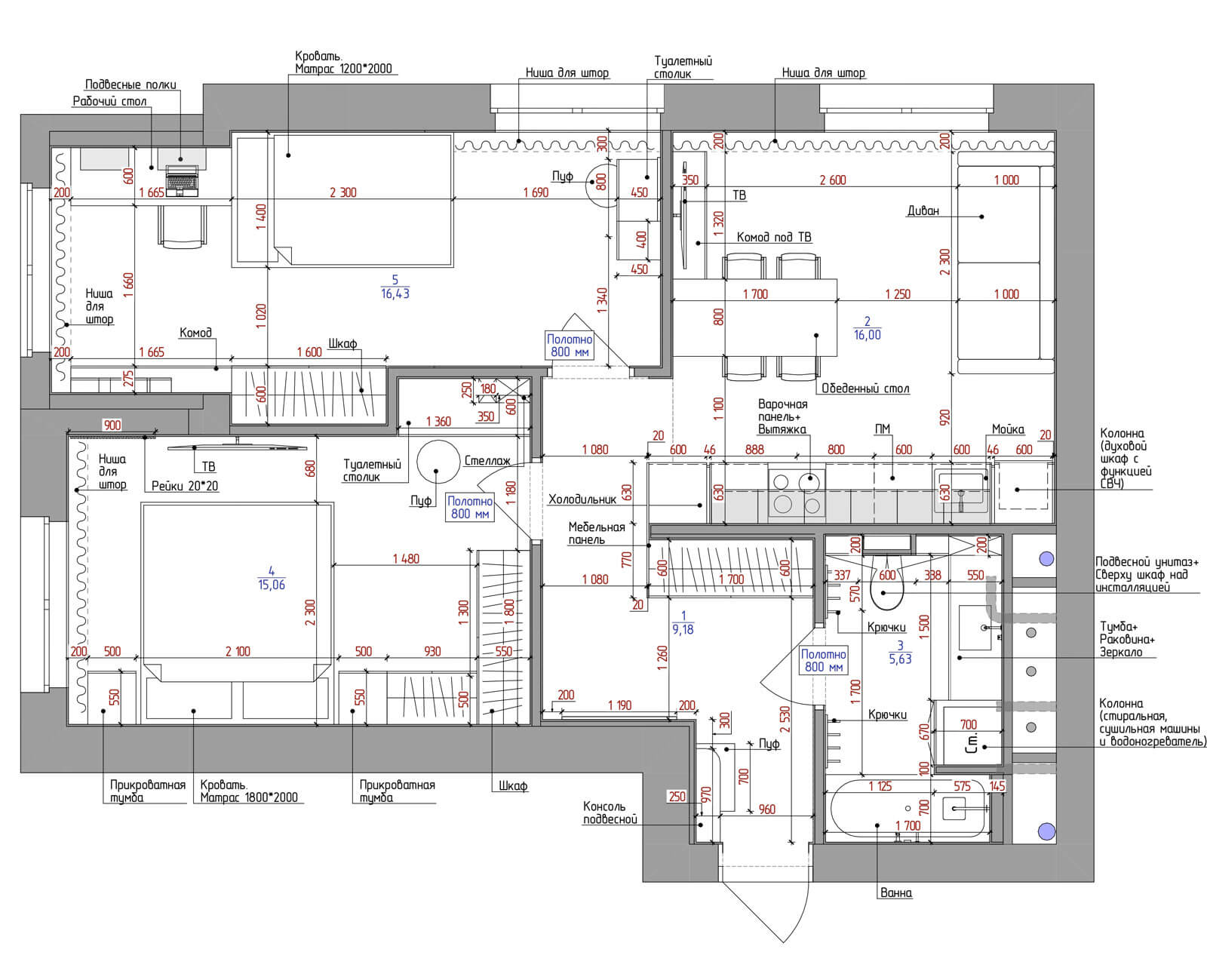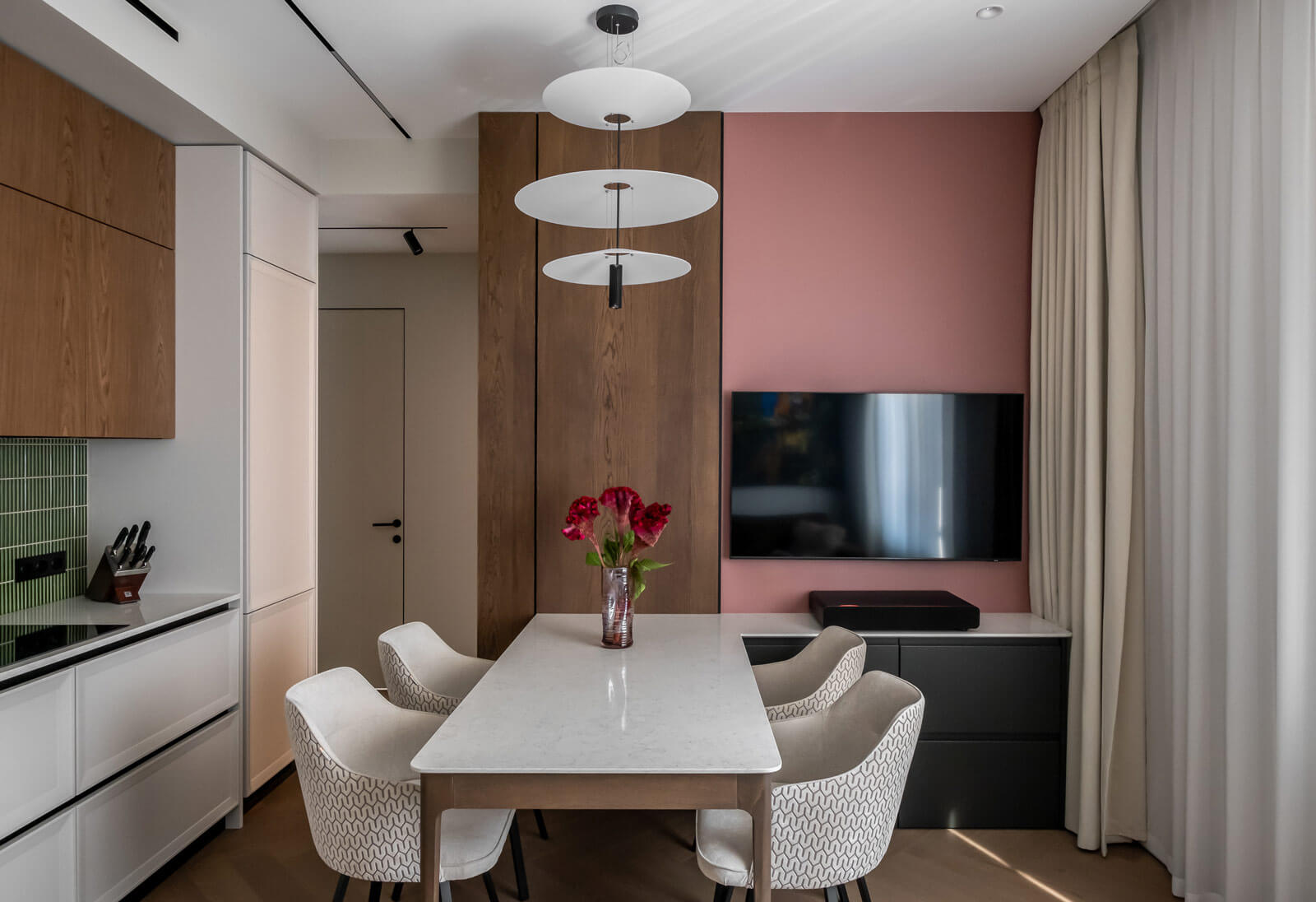 Использовали округлые прочные формы в интерьере как на стенах, так и на фасадах мебели, что добавляло нотку женственности интерьера, так как квартира планировалась для мамы с ребенком девочкой.