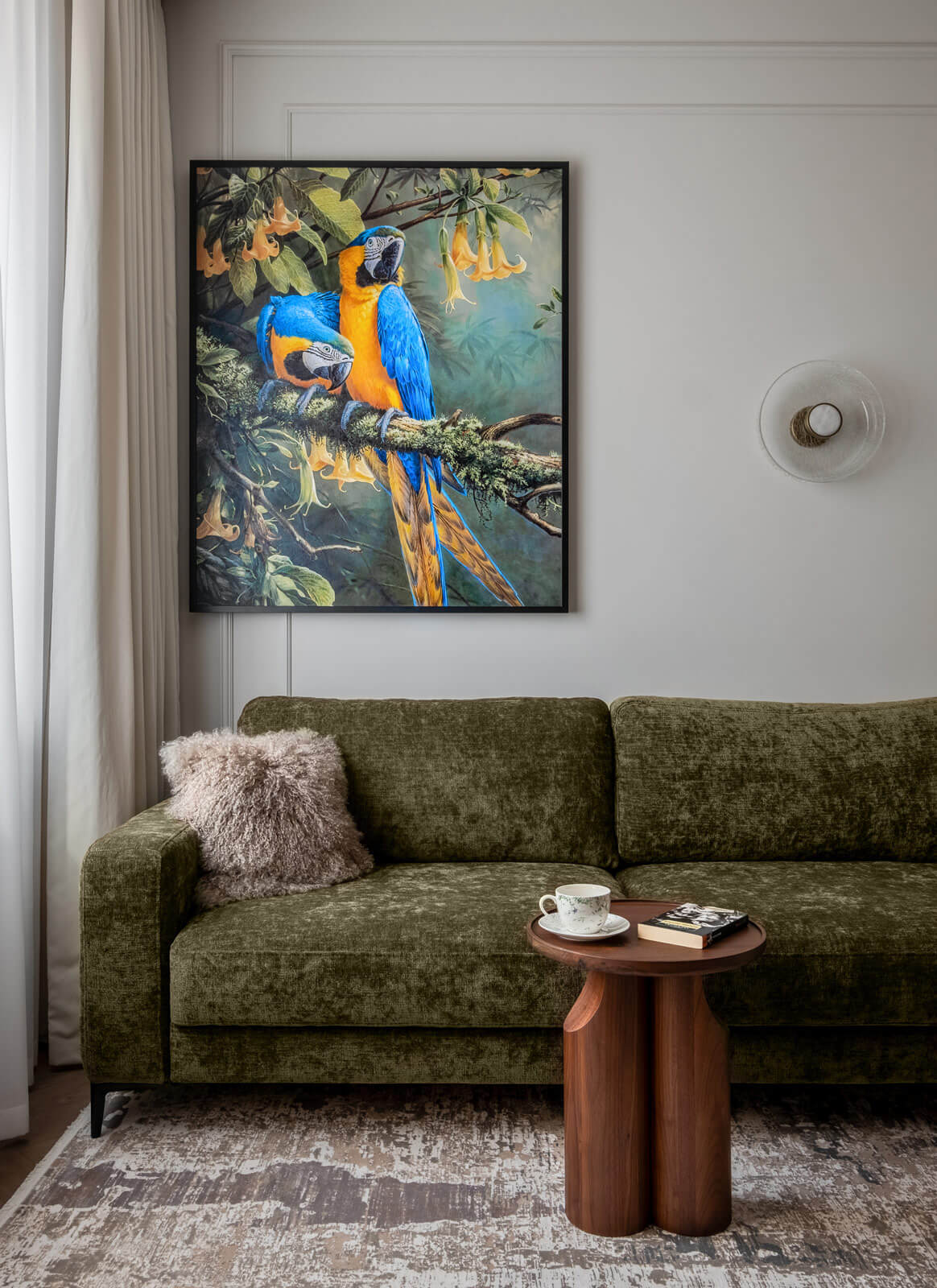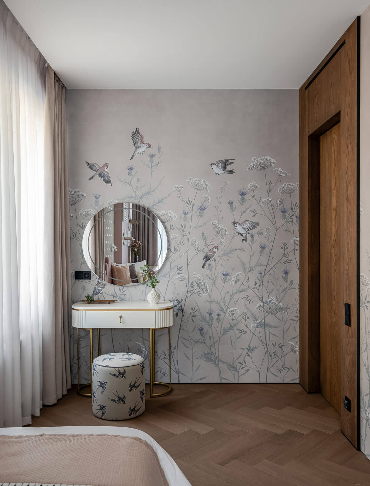Основная идея интерьера — зеленый цветущий сад с прекрасными птицами.