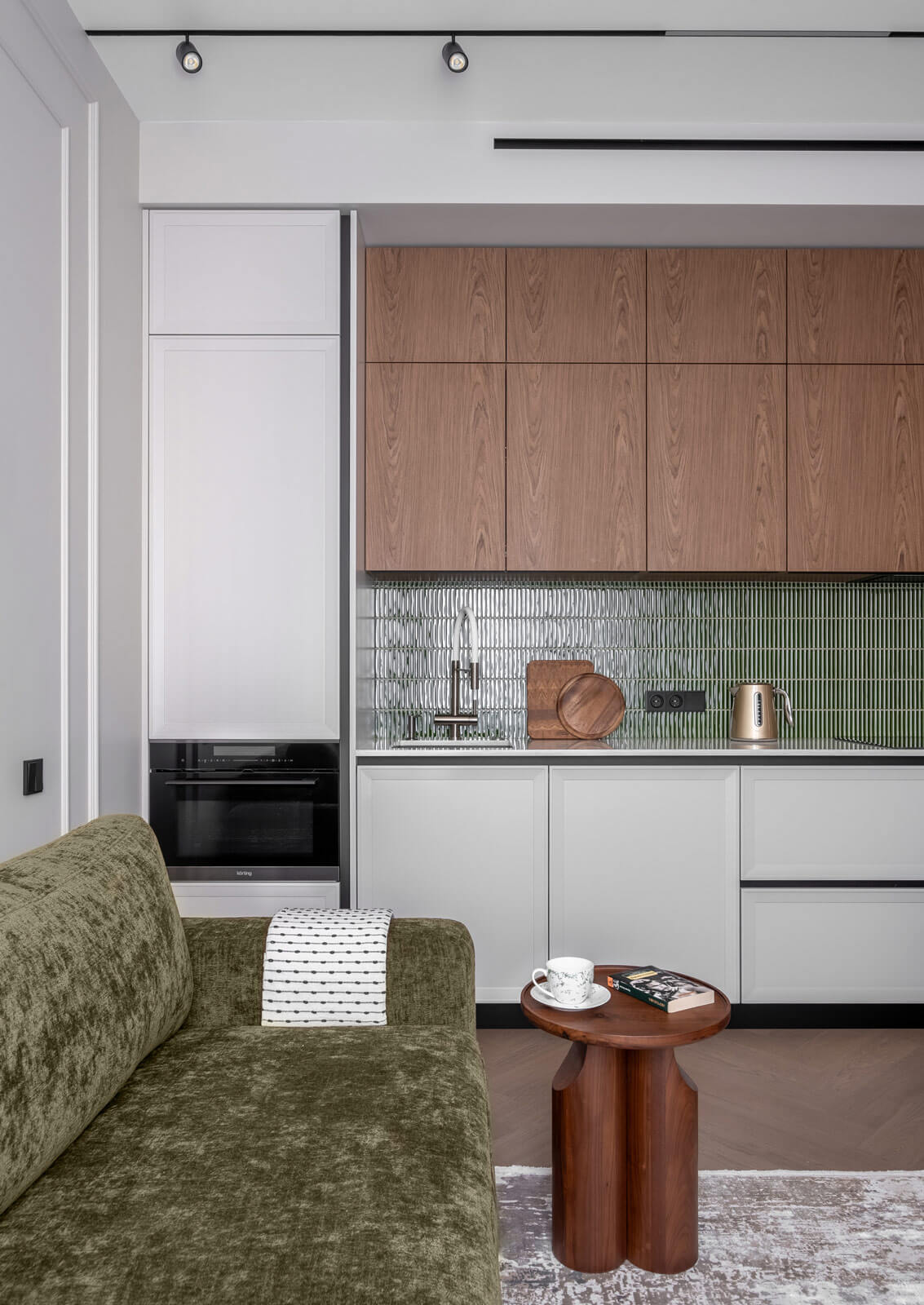 Зона кухни гостиной достаточно комфортная: кухня линейного типа, но при этом хватает рабочей поверхности для оптимального приготовления пищи.
