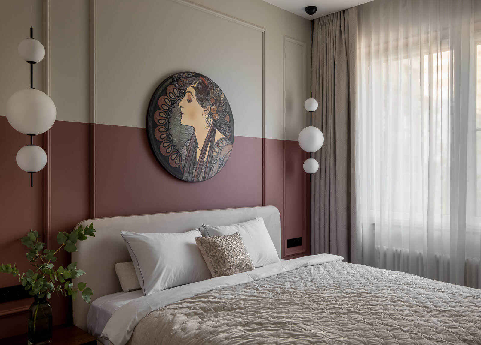 Главным интересным элементом является картина над кроватью в спальне — это часть картины Альфонса Мухи, которая идеально вписалась и в цветовую гамму, и в тематику интерьера.
