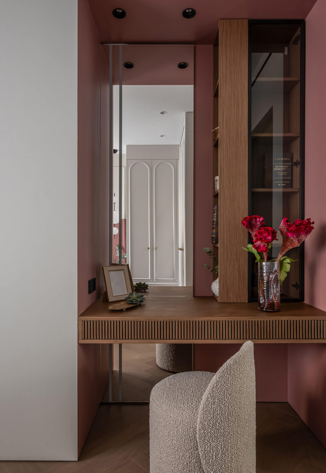 Акцентный цвет стен темно-пудровый, добавляет сочности спальне, и прекрасно выделяет две зоны: изголовье кровати и туалетный стол.