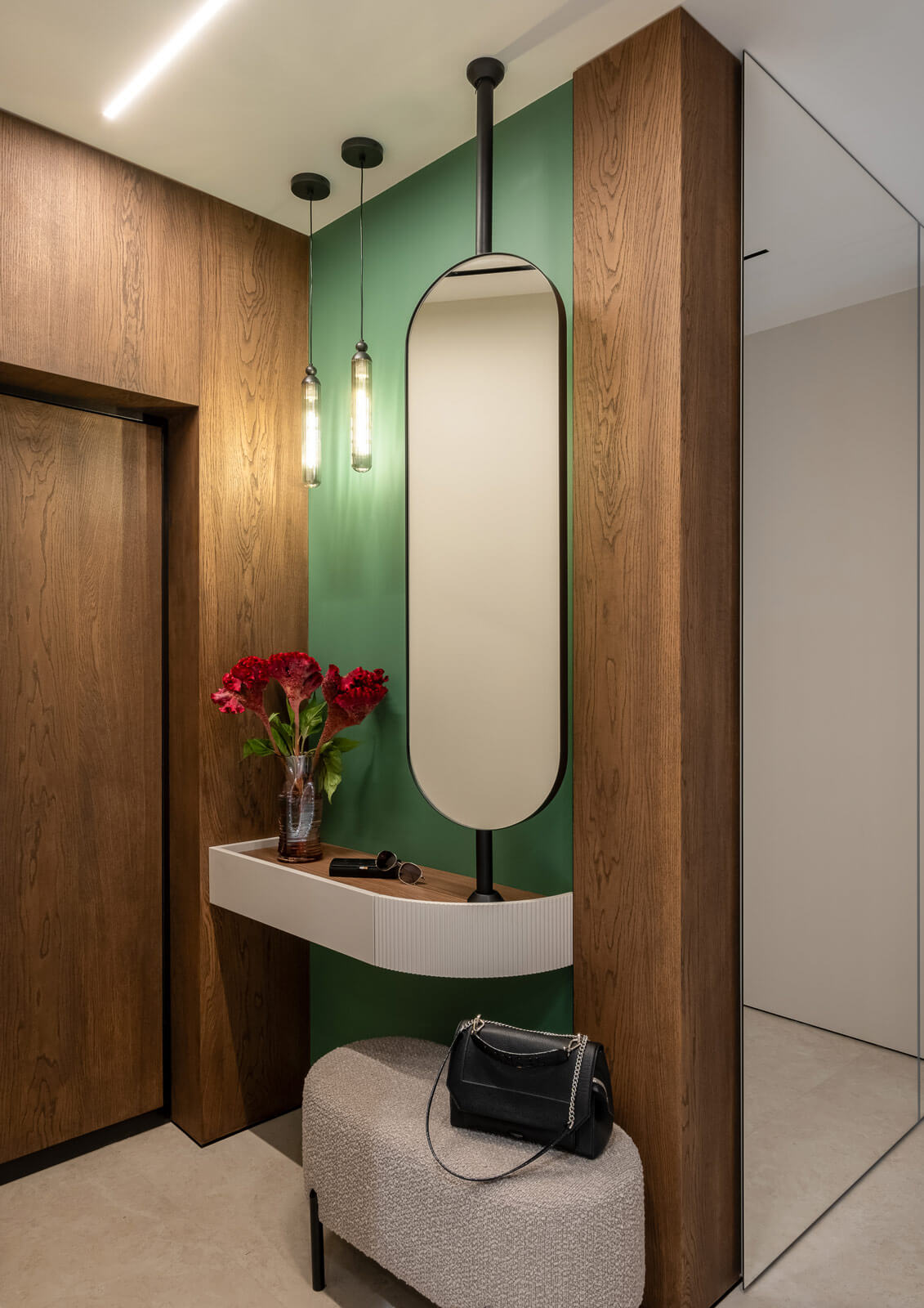 В прихожей нужно обратить внимание на планировку, насколько все эргономично продумано. Есть пуфик, для того, чтобы разуться, или поставить сумку, есть консоль для хранения косметики и мелочей, есть зеркало с поворотным механизмом, в которое удобно смотреться при выходе из квартиры. Так же есть ростовое зеркало, вместительный гардеробный шкаф для верхней одежды.