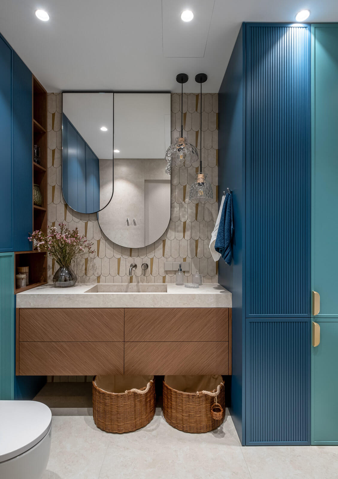 Ванная комната: сочетание цветов, насколько грамотно был подобран каждый оттенок между собой. Качественная сантехника и удобство в хранении: полочки из керамогранита, шкаф над инсталляцией, ящики под раковиной, а также большой шкаф со стиральной и сушильной машинами.