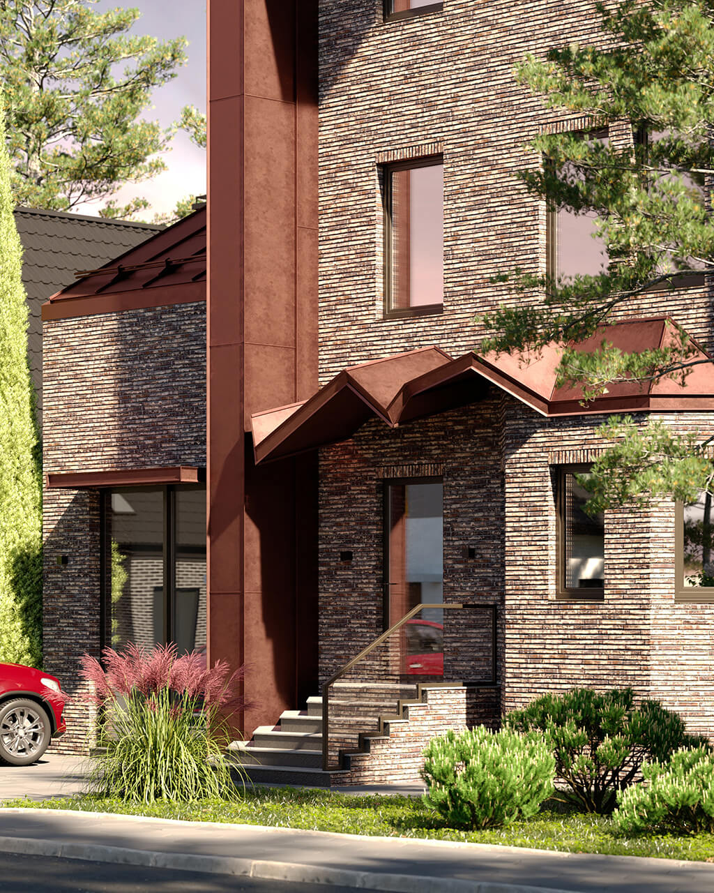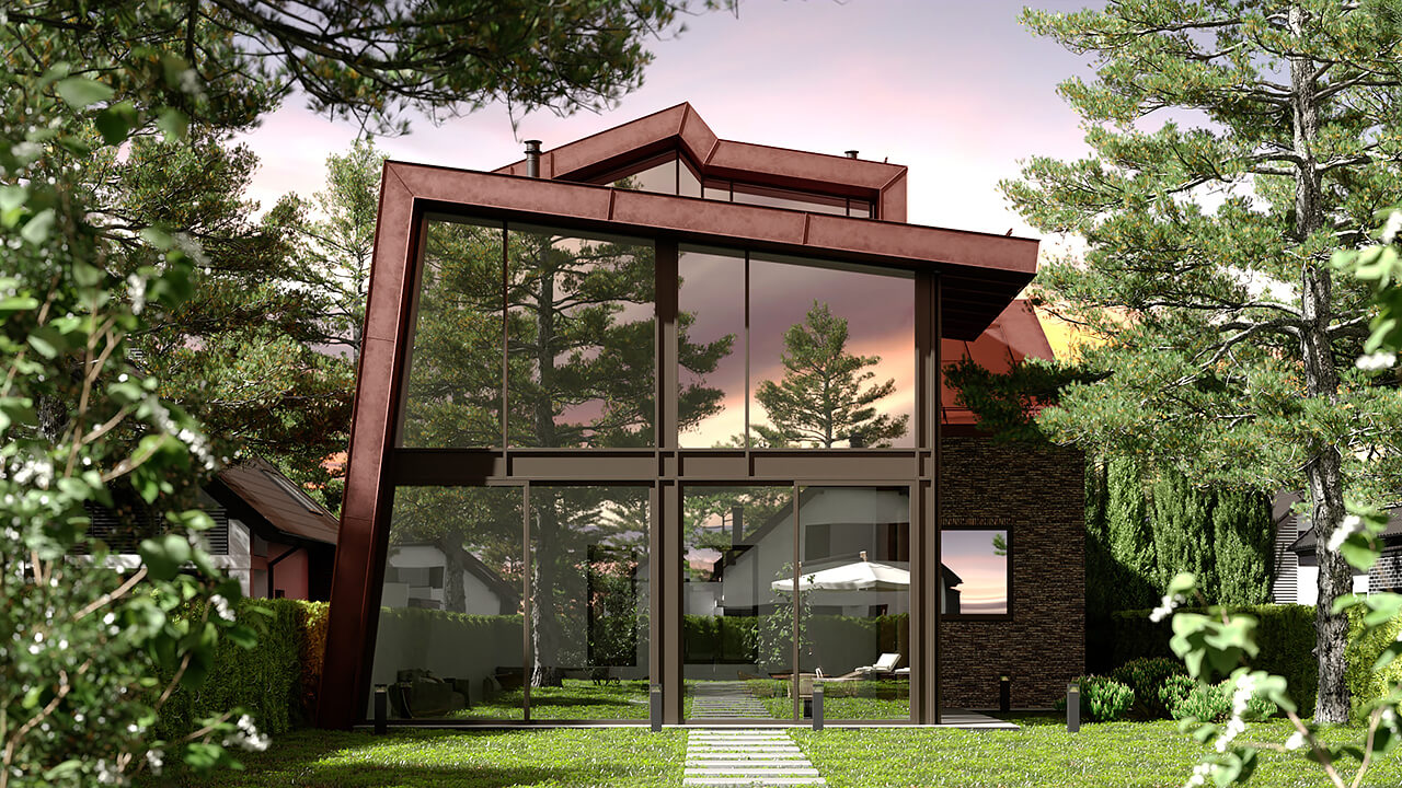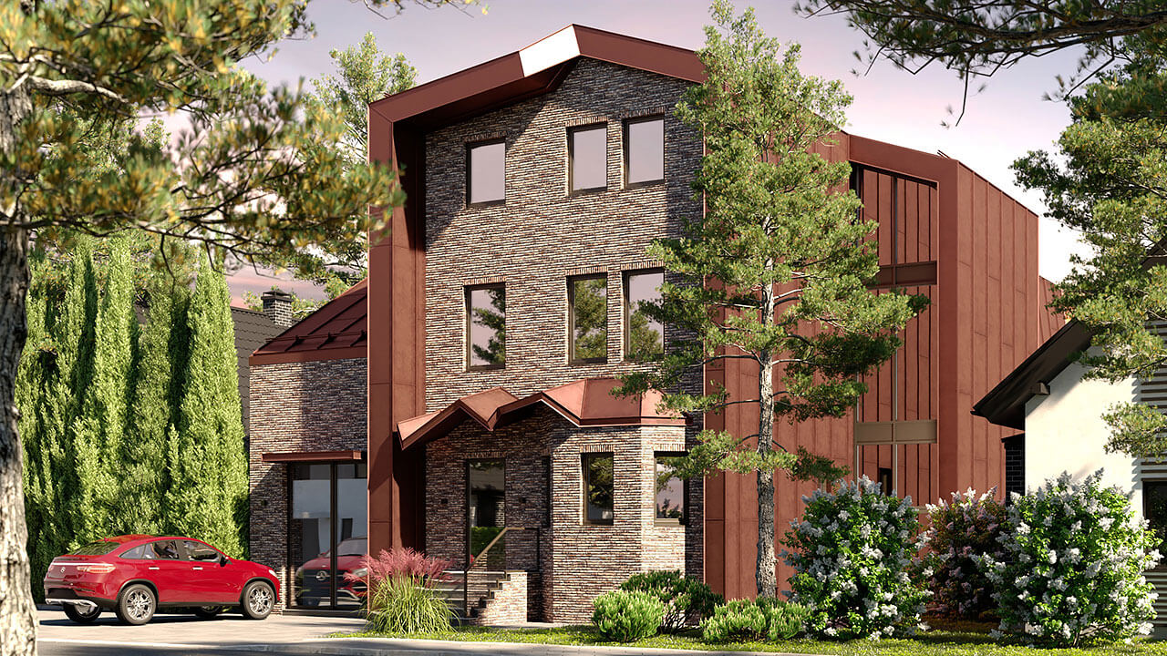 Особенно сложно было интегрировать в новую концепцию эркер, расположенный около главного входа в дом. В результате многочисленных вариантов, было найдено интересное решение — эркер приобретает новую кровлю, а также задает начальную точку нового козырька над входом.