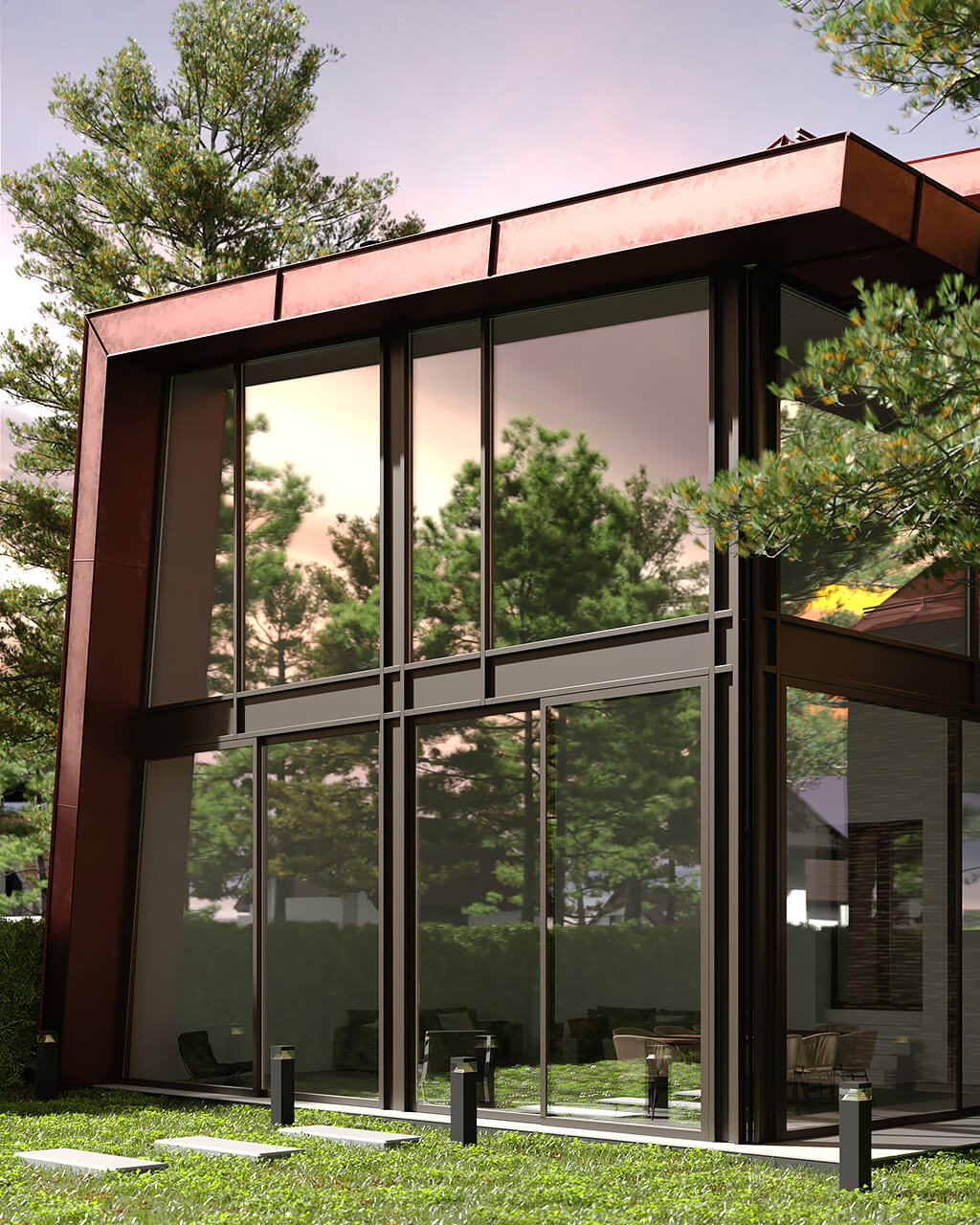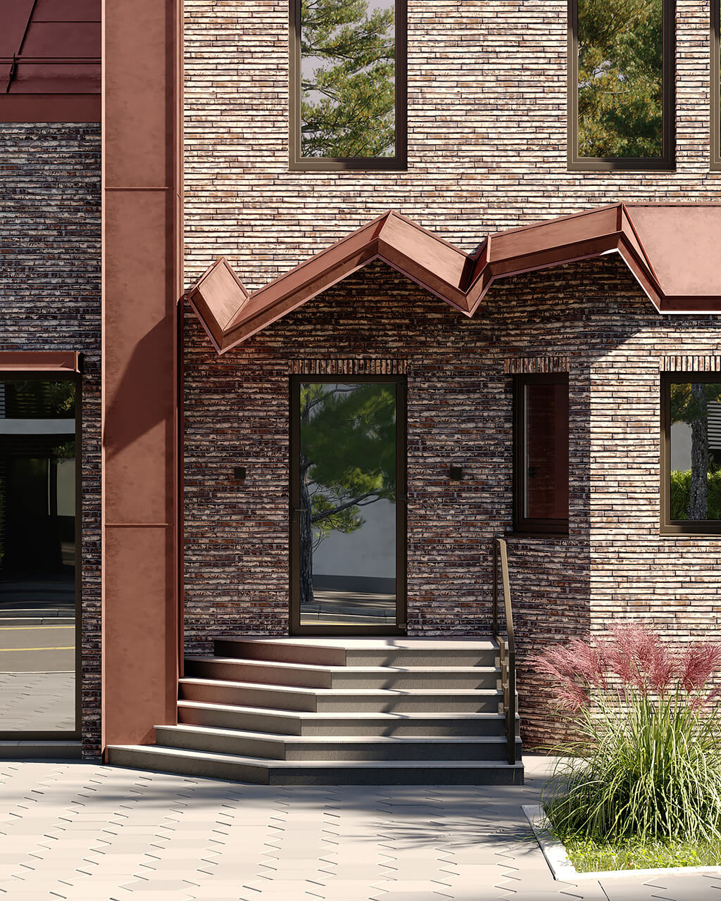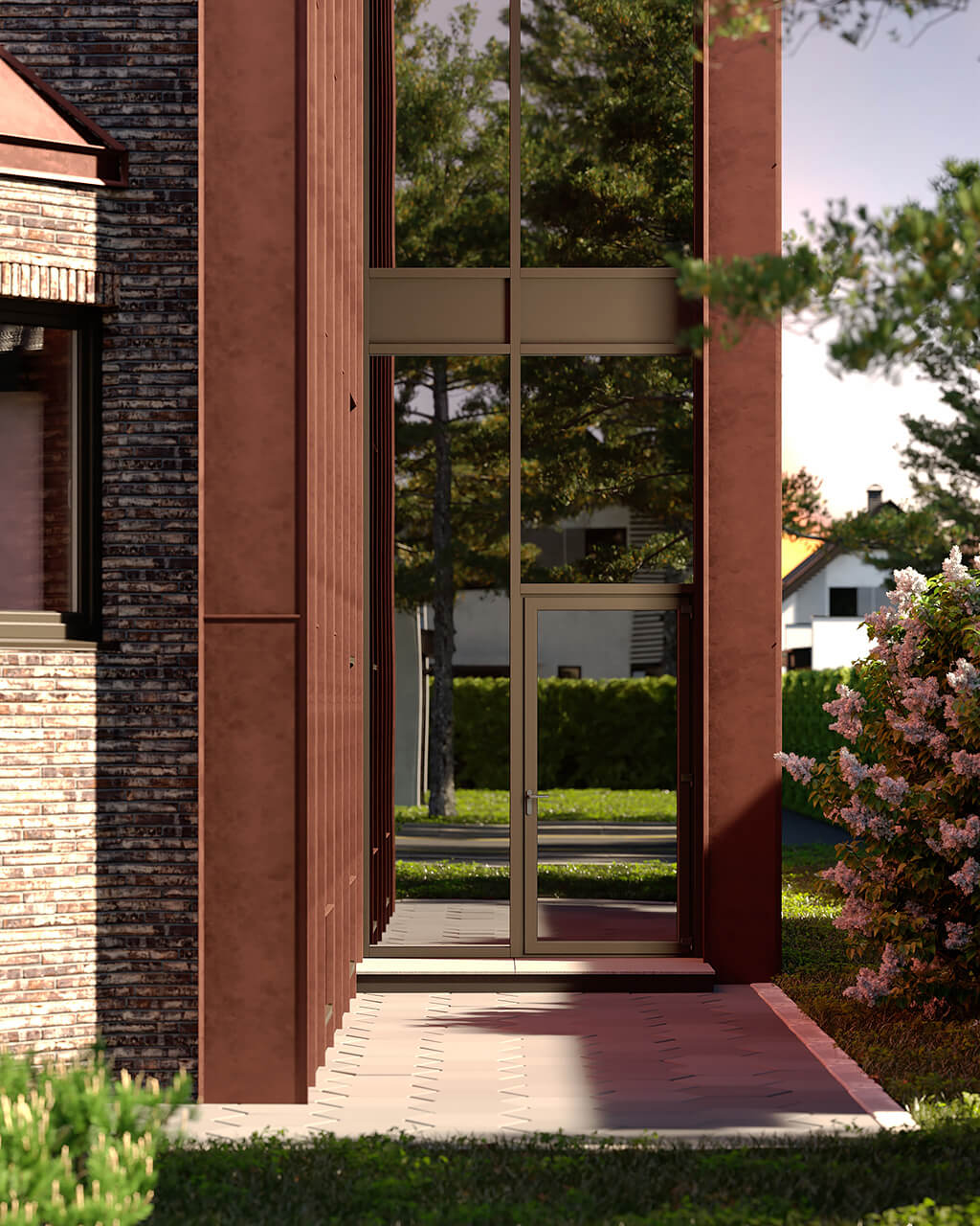 Особенно сложно было интегрировать в новую концепцию эркер, расположенный около главного входа в дом. В результате многочисленных вариантов, было найдено интересное решение — эркер приобретает новую кровлю, а также задает начальную точку нового козырька над входом.