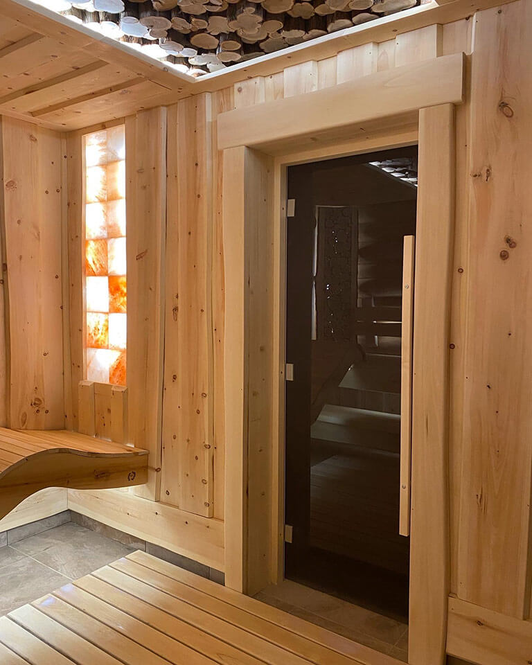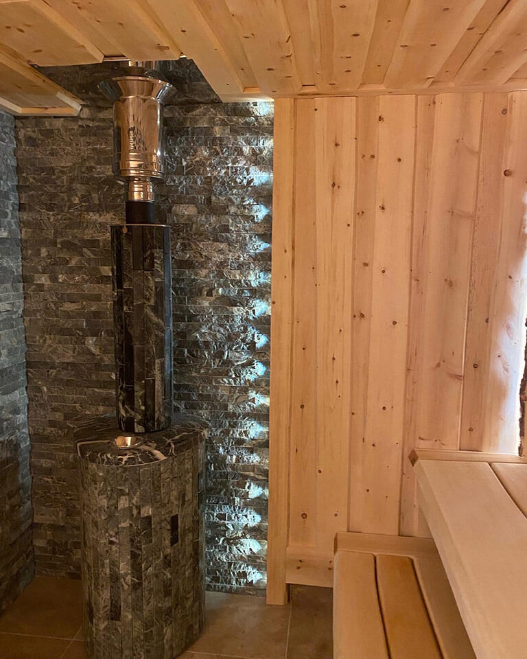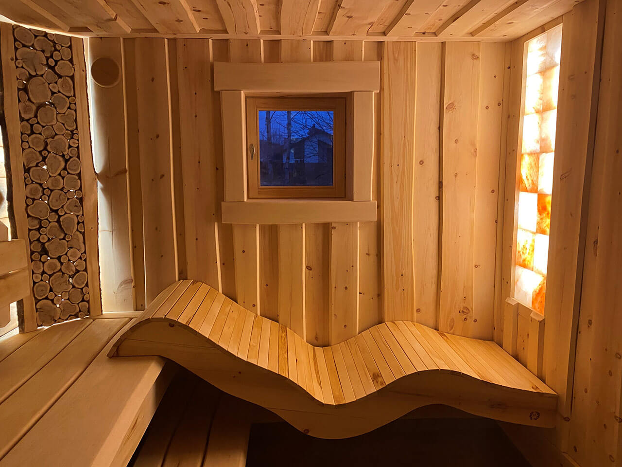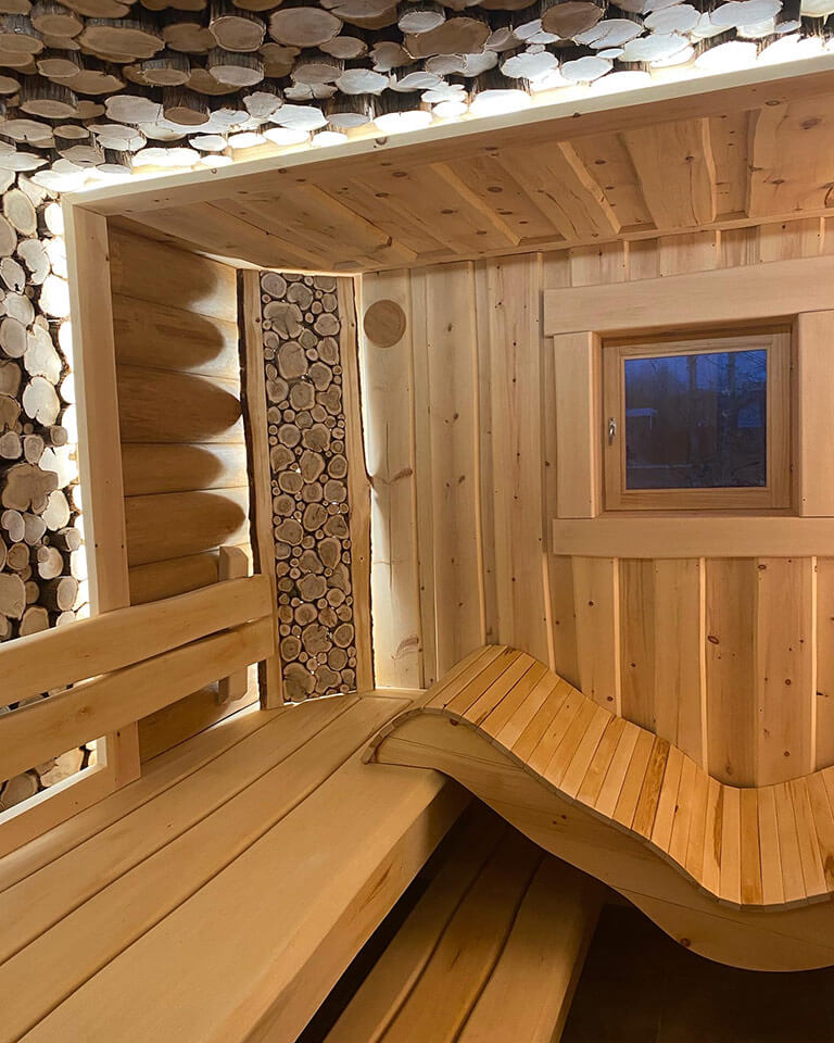 - Одна из стен обшита имитацией бревна, материал ольха. На остальных стенах и потолке доска из Алтайского кедра. От полога и по всему потолку проходит 3D панно из спилов можжевельника, которое подсвечивается с обоих сторон.