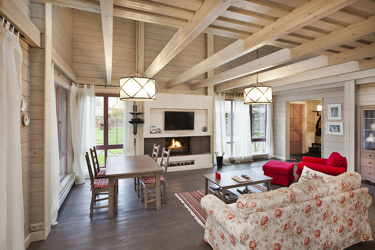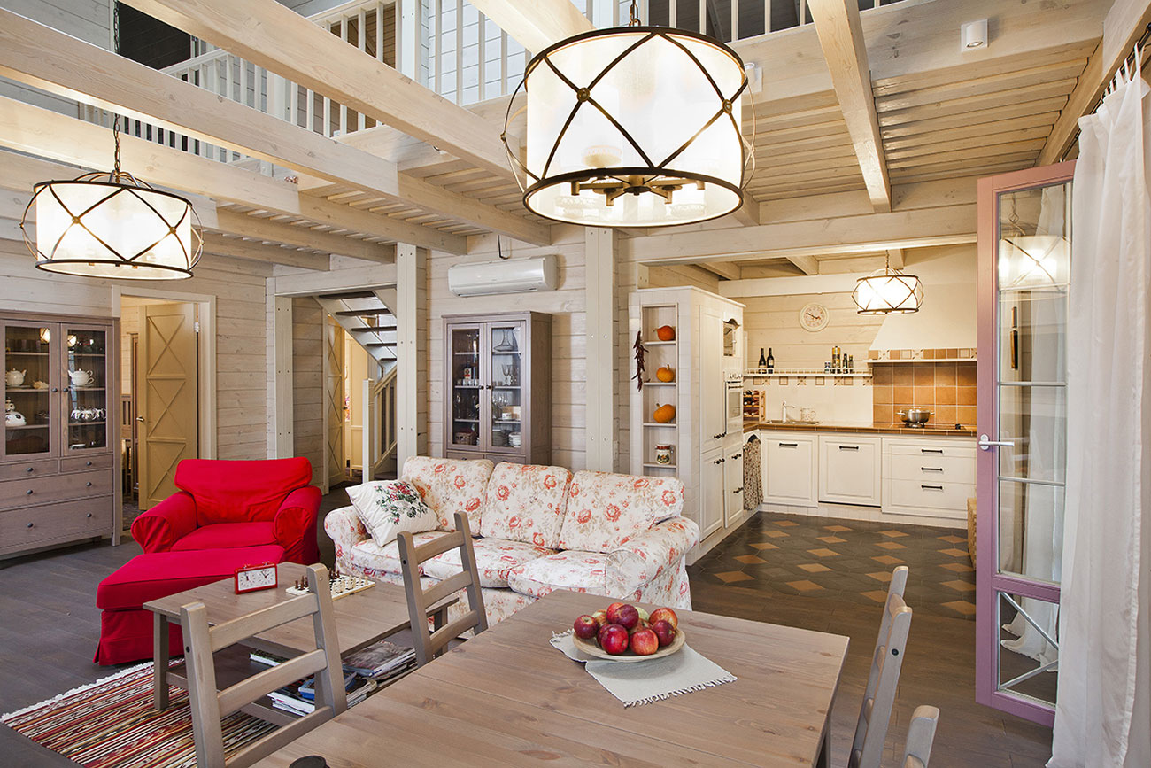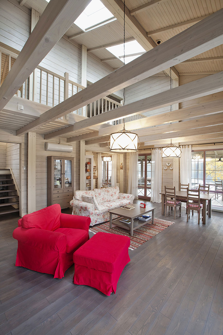 Дневная зона дома: прихожая, двусветная гостиная с кухней-столовой и остекленной верандой, две спальни и душевая. Деревянная лестница ведет на антресоль второго этажа, где находятся дополнительные спальни. Котельная с отдельным входом с улицы.
