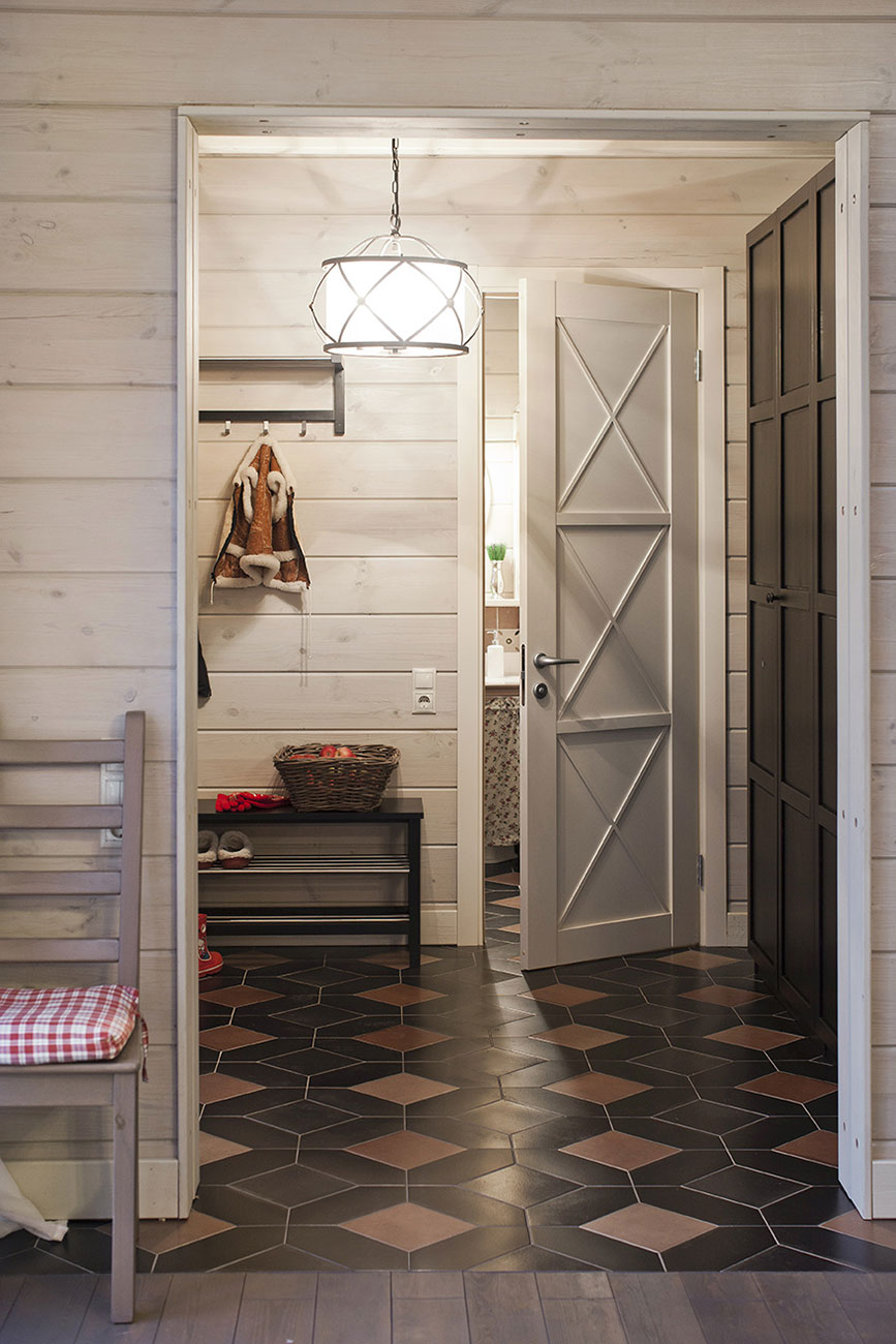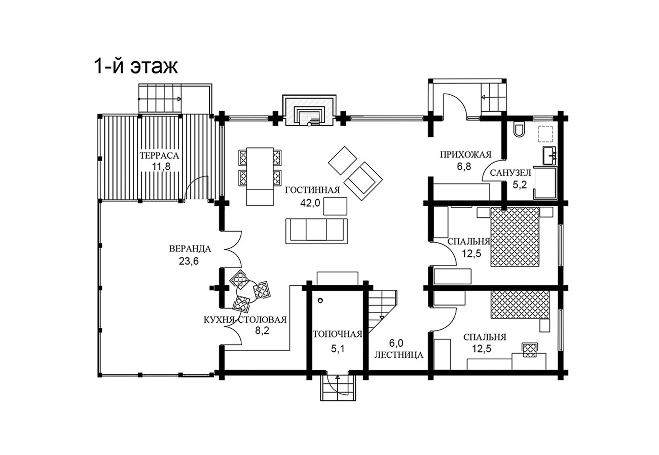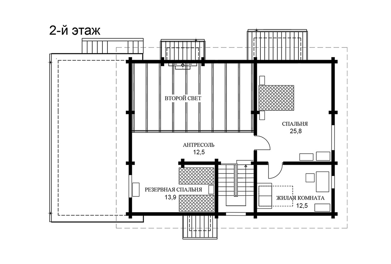 Дневная зона дома: прихожая, двусветная гостиная с кухней-столовой и остекленной верандой, две спальни и душевая. Деревянная лестница ведет на антресоль второго этажа, где находятся дополнительные спальни. Котельная с отдельным входом с улицы.