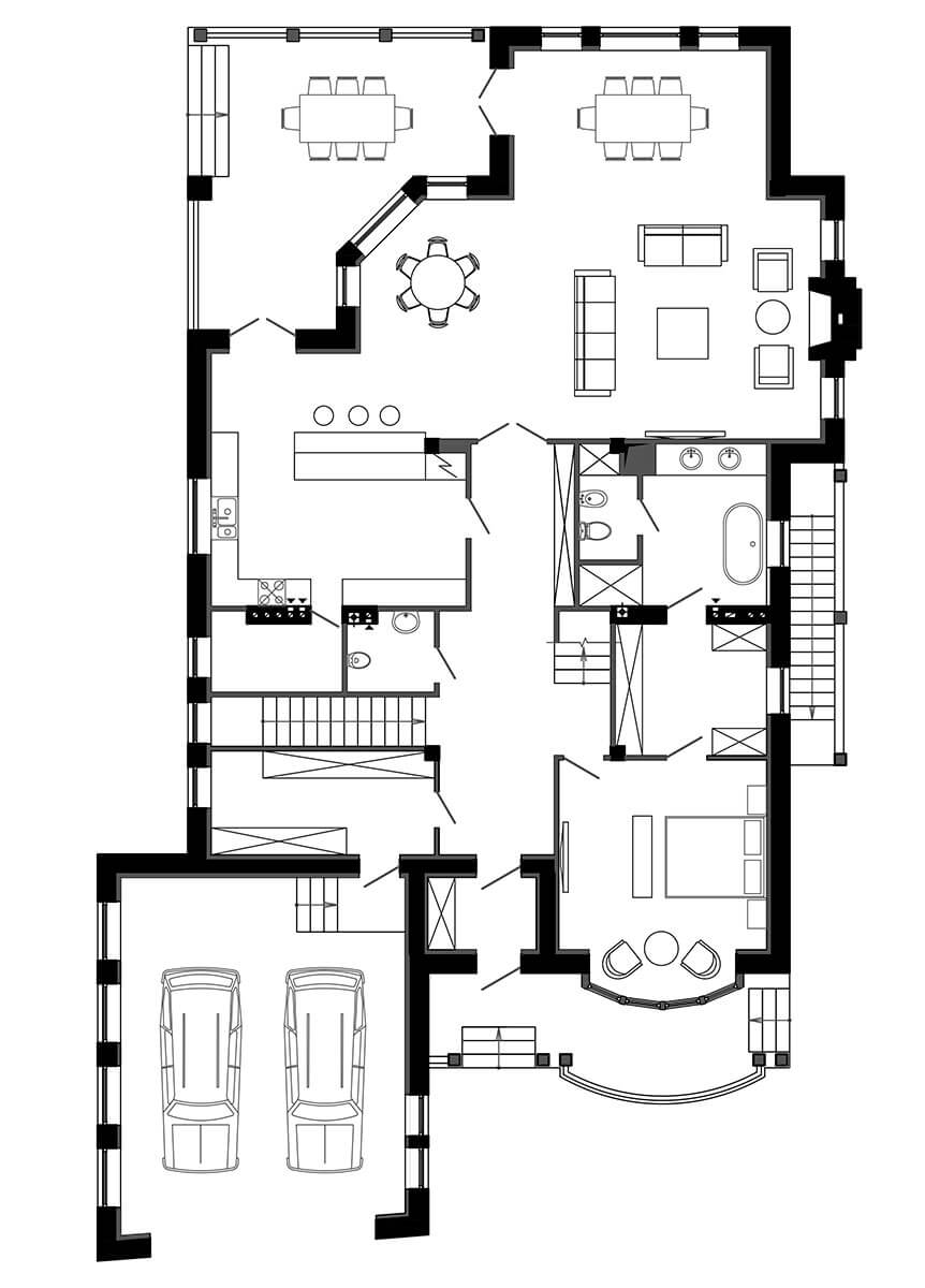 «Mrs. Valentina» располагается на участке (угловом, с несколькими заходами) таким образом, что образует вокруг себя ряд двориков. Самый большой — задний двор для отдыха. С бассейном, с террасой, с выходом из спа-зоны… «Mrs. Valentina» и «Mr. Valentine» объединены значительной частью общедворового пространства — именно за счет этого дома не «зажимаются» окружающей застройкой. Приятный бонус — возможность обоюдной просматриваемости участков.