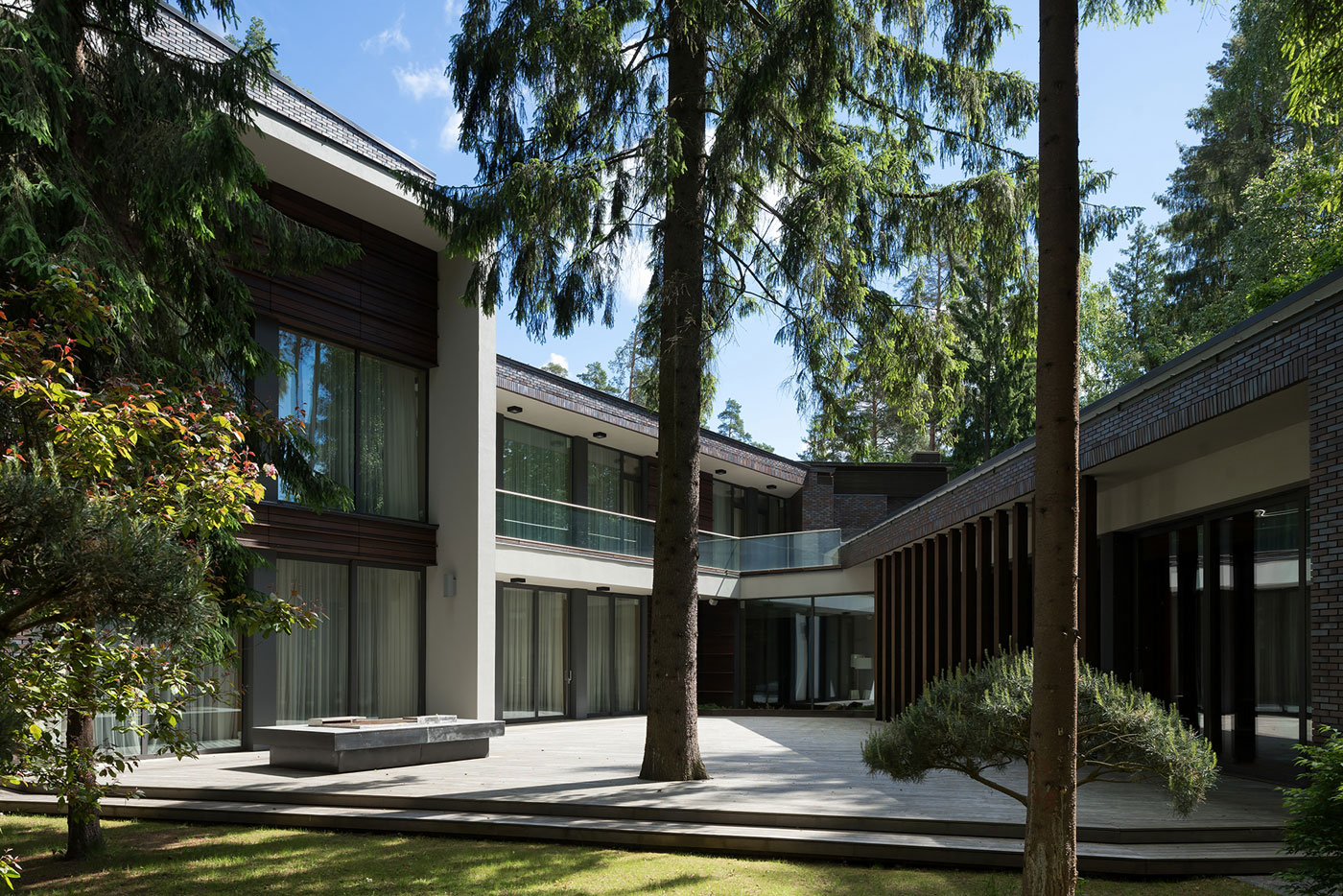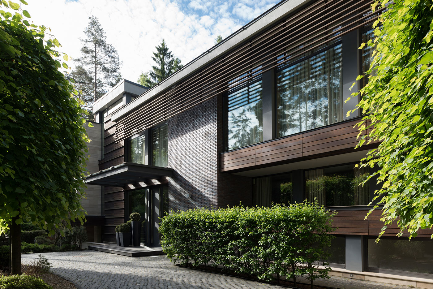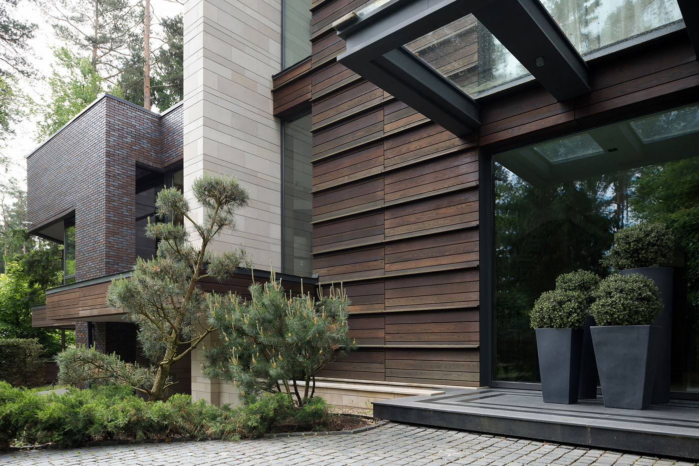 Для отделки фасадов использованы клинкерный кирпич и натуральный камень доломит, а для мощения территории — натуральный термообработанный гранит и деревянный декинг.