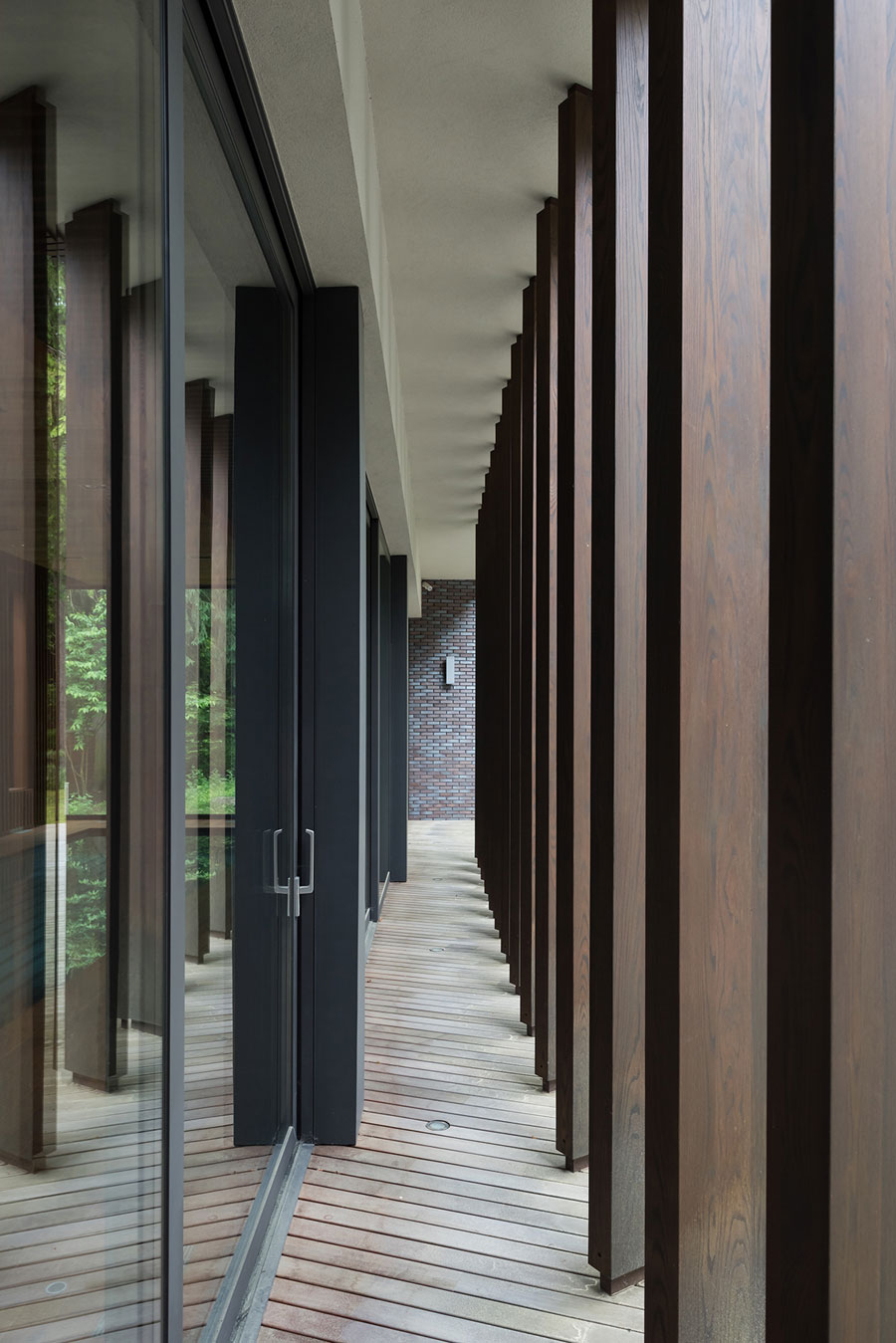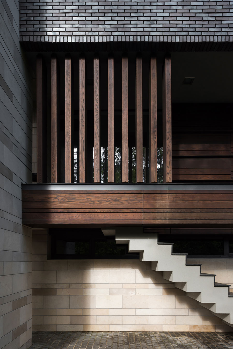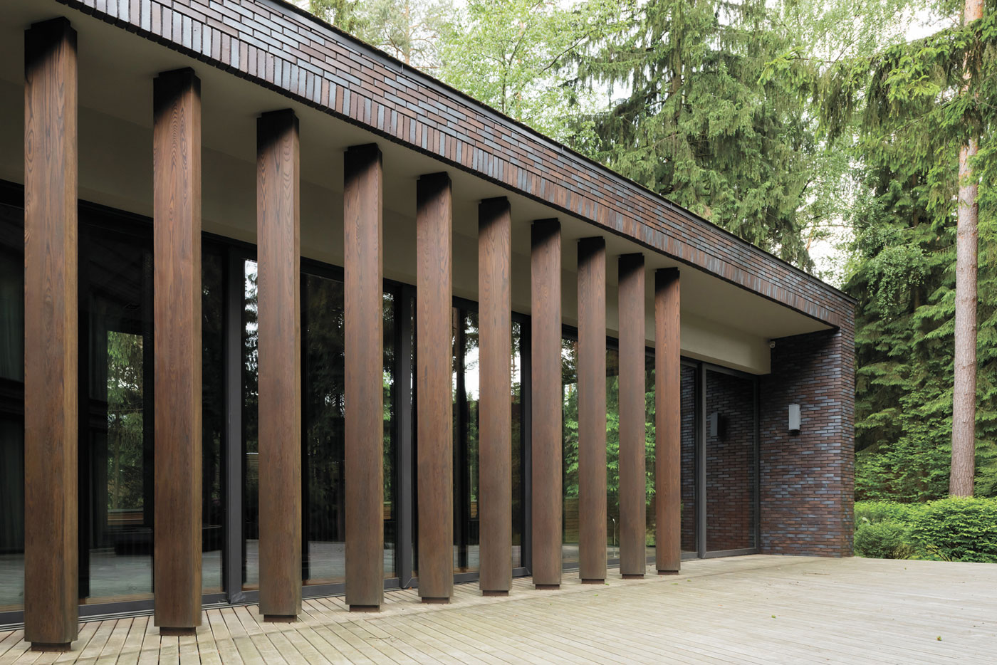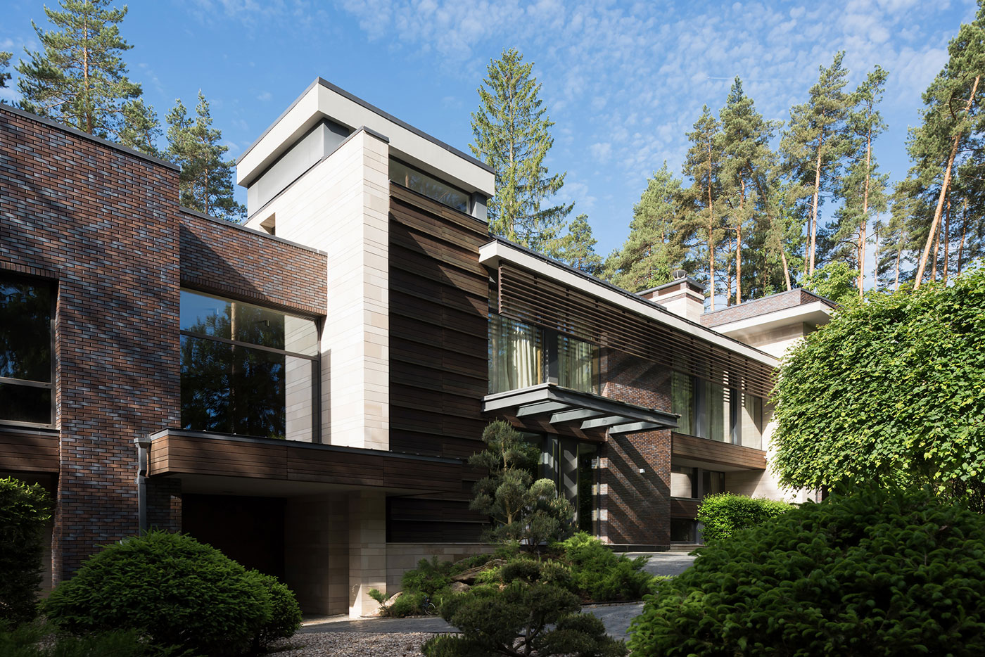 Для отделки фасадов использованы клинкерный кирпич и натуральный камень доломит, а для мощения территории — натуральный термообработанный гранит и деревянный декинг.