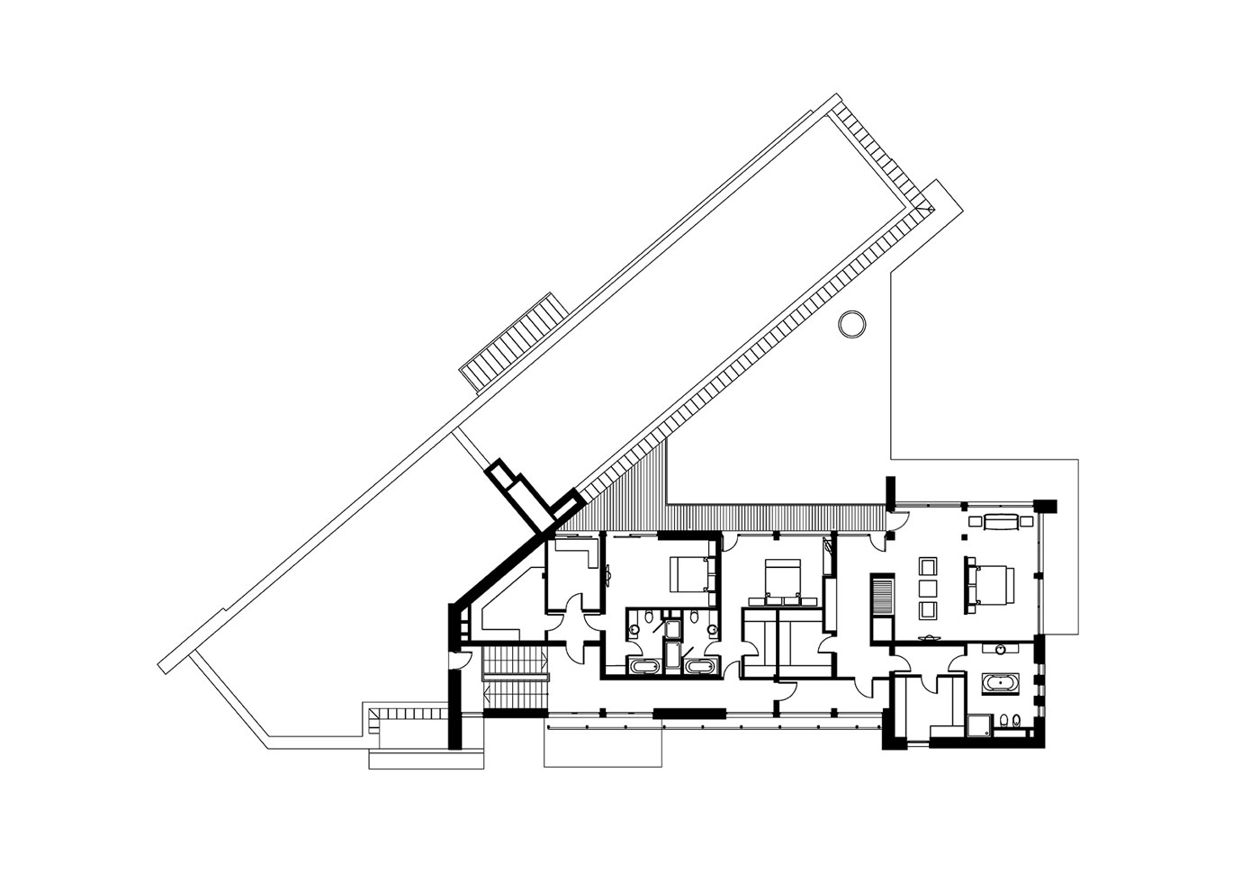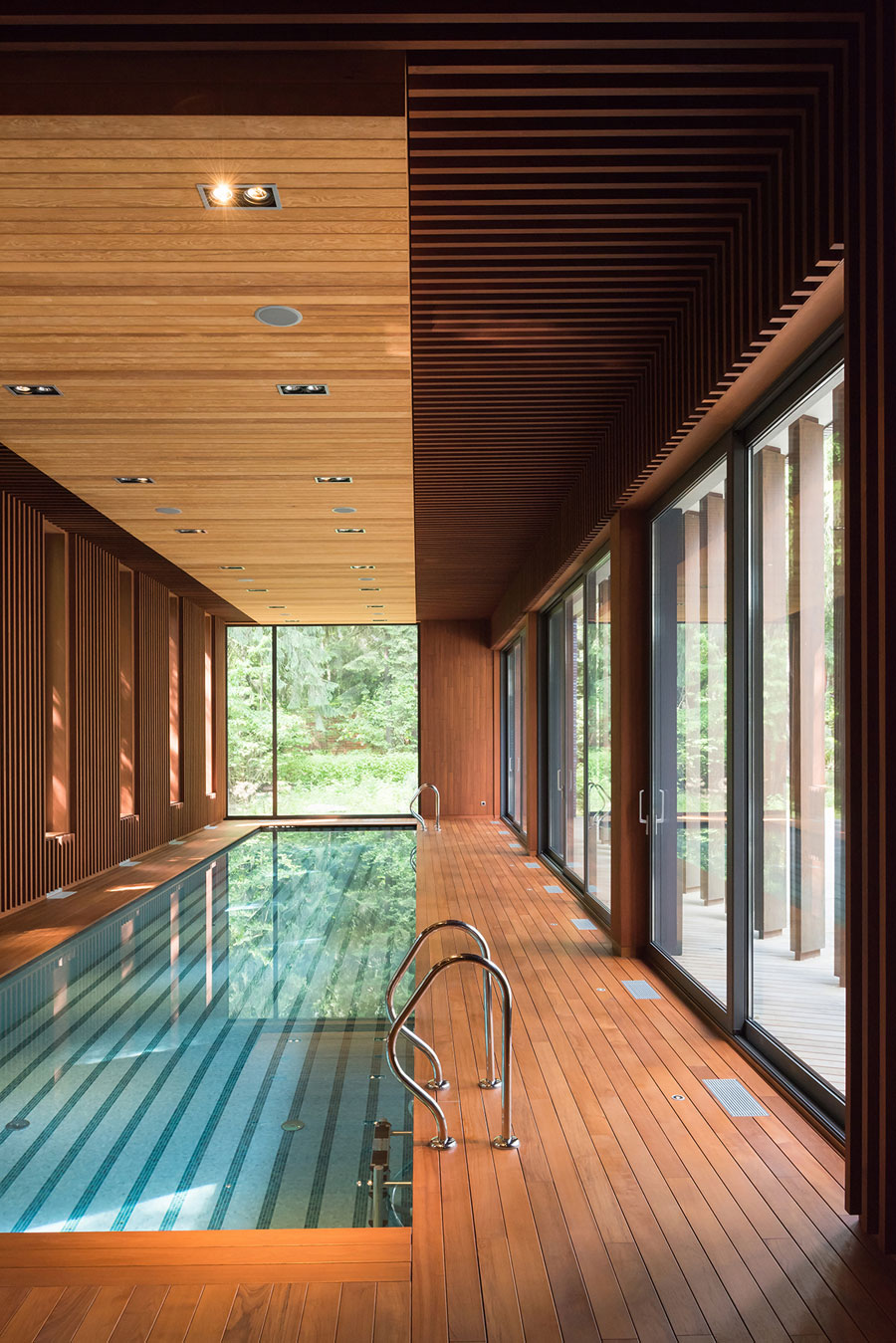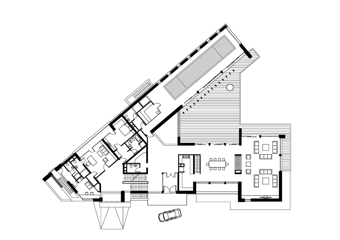 Форма дома повторяет форму треугольного участка. При посадке удалось сохранить столетние сосны, окружающие коттедж.