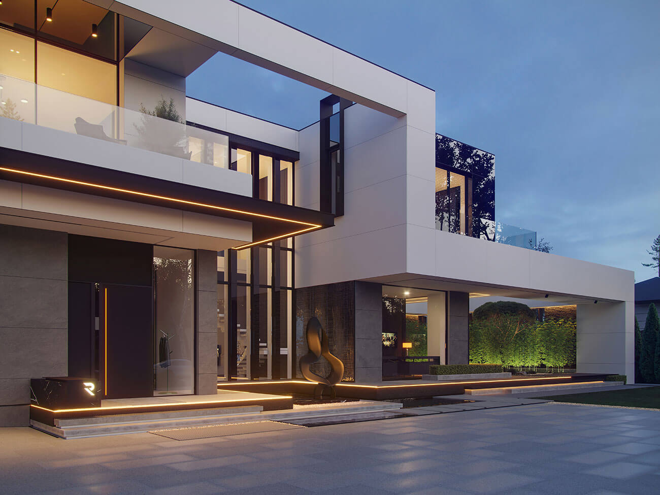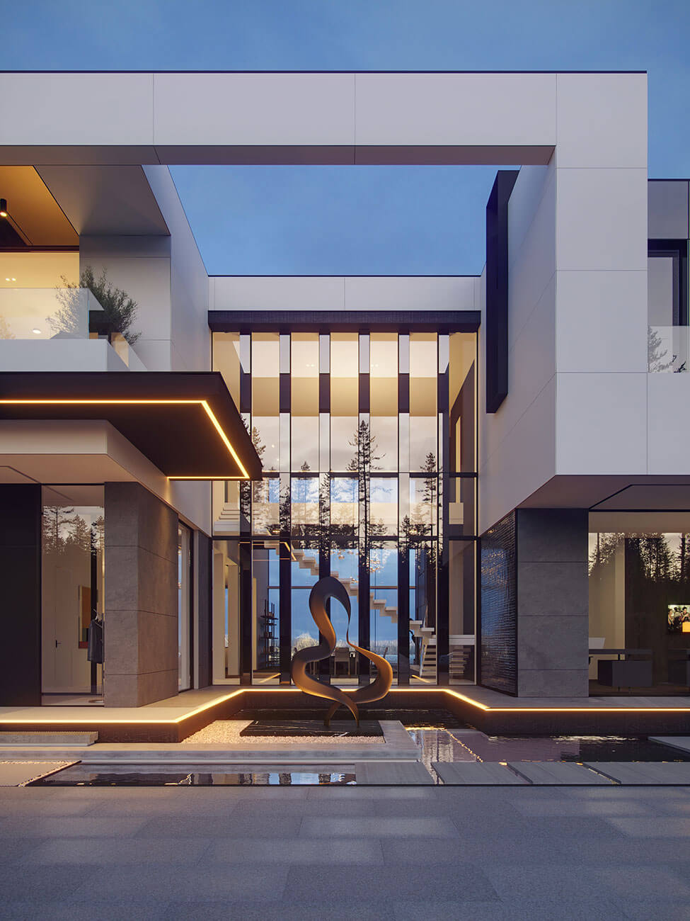 Главный вход со стороны леса оформлен парадно. Справа от крыльца внутренний двор, раскрывающийся в сторону леса, в центре которого посреди декоративного водоема расположена абстрактная скульптура, пол водоема выполнен из ударопрочного стекла и является одновременно окном для проникновения естественного света в цокольный этаж здания. Визуальный эффект усиливается водопадом, струящимся по стене справа от скульптуры. Светопрозрачная северная стена внутреннего двора открыта в двухсветный объем гостиной, в свою очередь раскрытой через панорамное окно в два этажа на озеро.