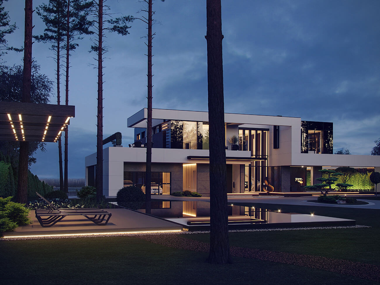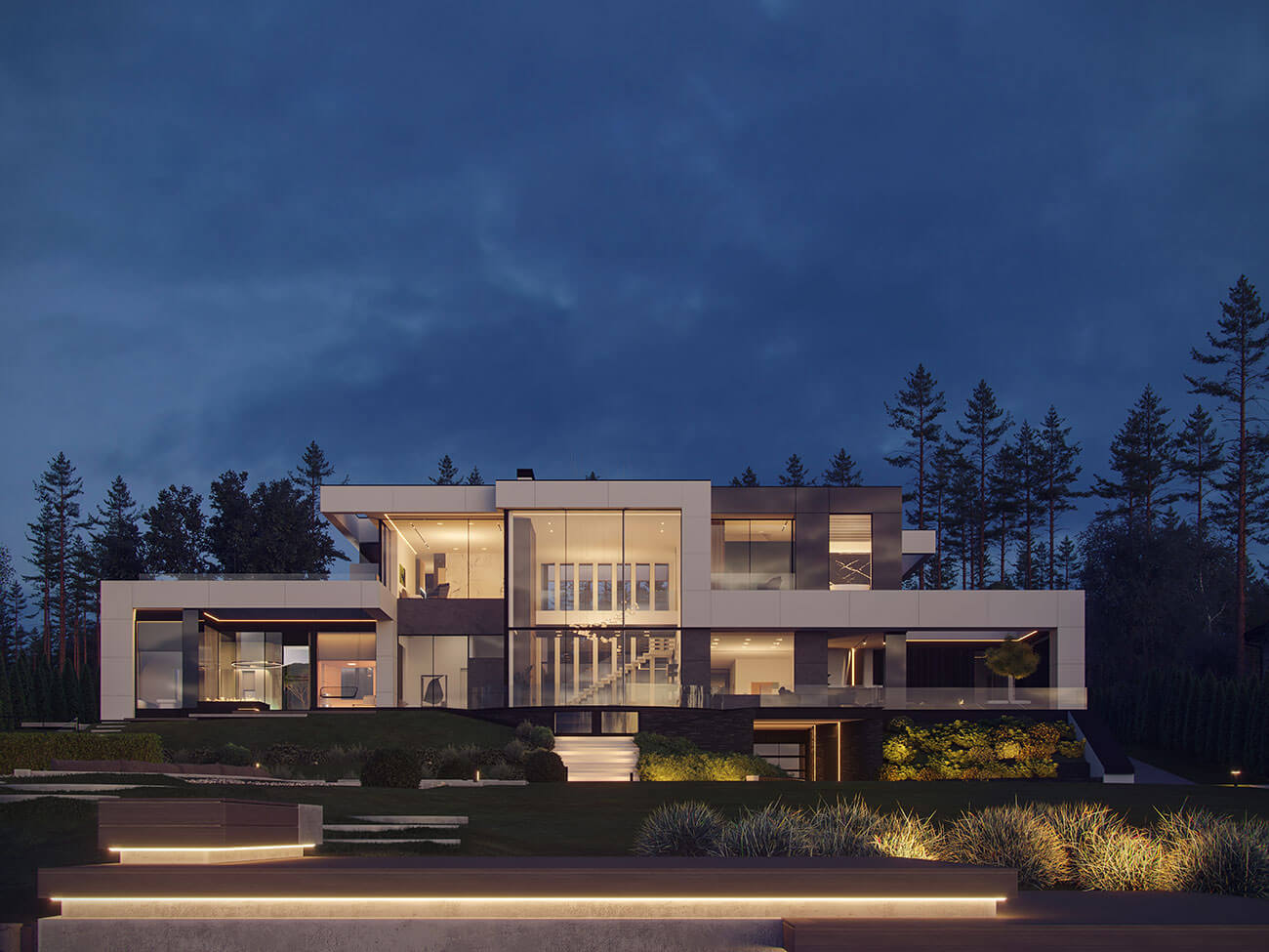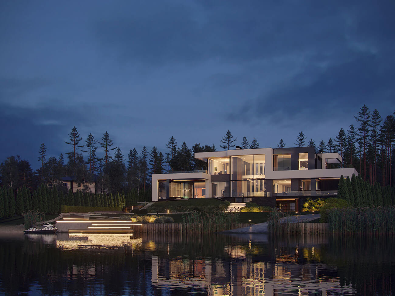 Со стороны озера здание приподнято за счет искусственной насыпи от уровня естественного рельефа участка до террасы первого этажа. Центром композиции является панорамное окно гостиной с парадной лестницей под ним.