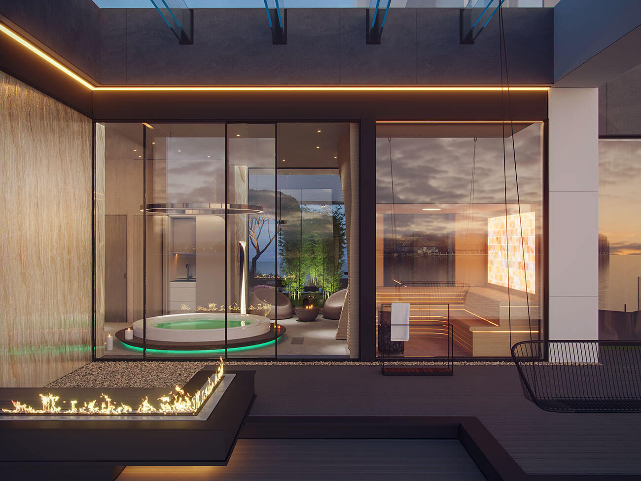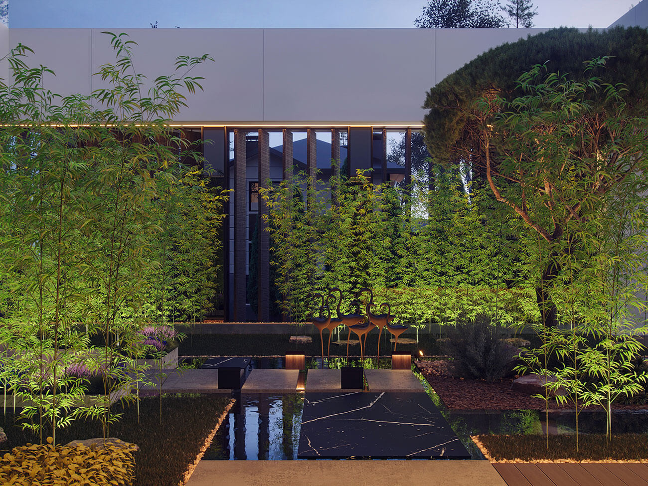 В правой части дома обустроена терраса, внутри которой разбит декоративный сад. Ядром сада является дерево с раскидистой кроной, вокруг которого расположен декоративный водоем, окаймленный бамбуковыми порослями и клумбами. В глубине сада находится зона отдыха, углубленная в полу с встроенной мебелью; через сад проложена сложная сеть дорожек и тропинок из различных материалов. За садом находится помещение спа с панорамными окнами, благодаря чему из сада обеспечивается вид на озеро.