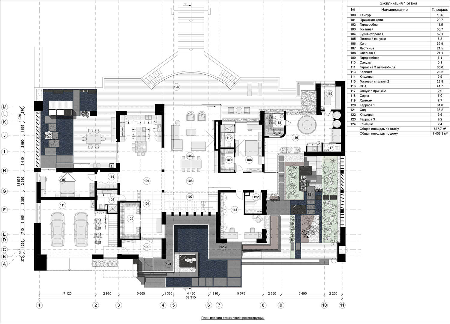 В отделке фасадов использованы крупноформатный керамогранит, черный стемалит, клинкерный кирпич темно-серого цвета и деревянные рейки со сложной рельефной обработкой, тонированные в цвет горького шоколада.