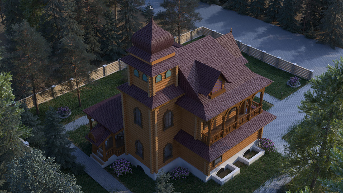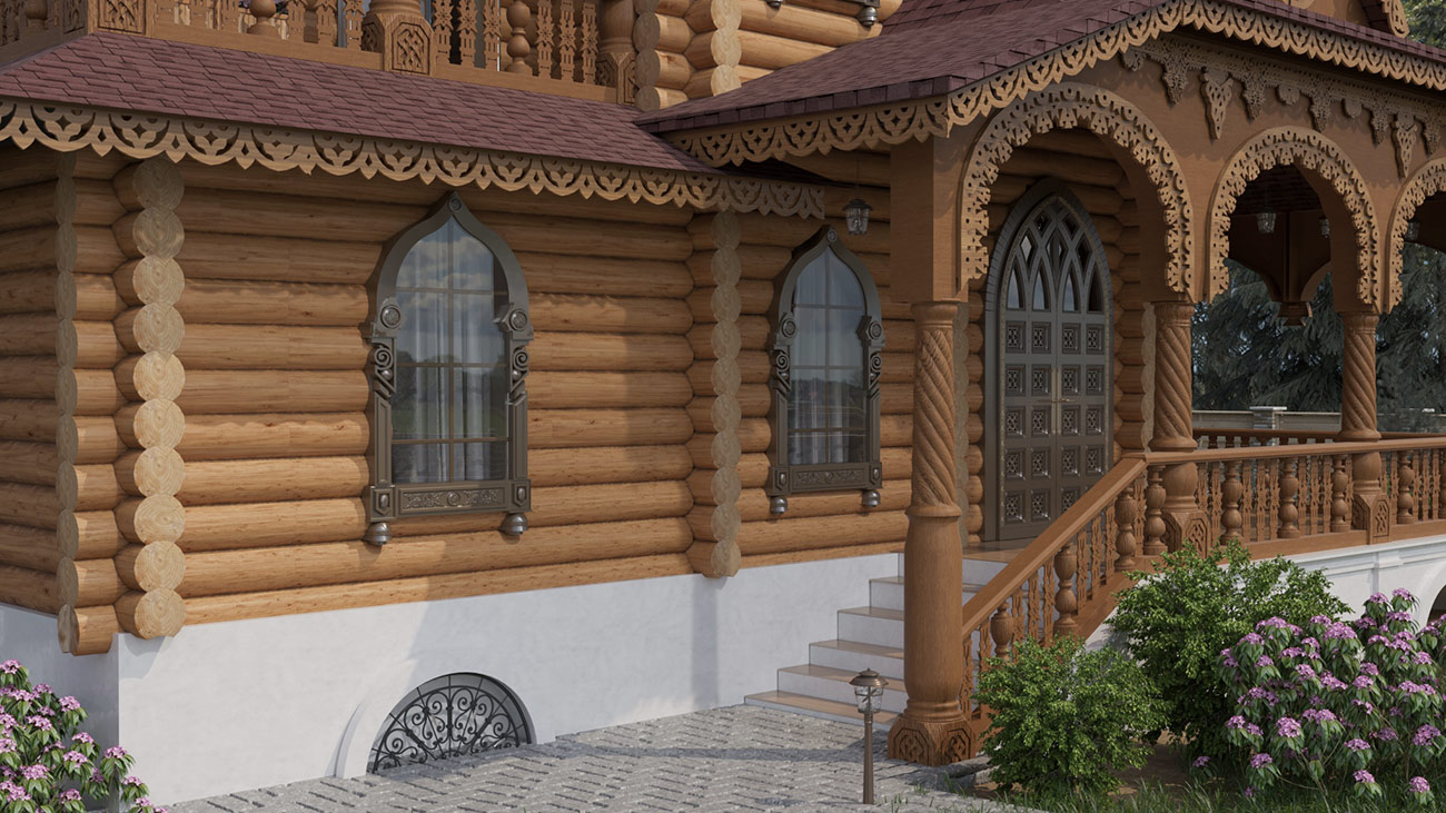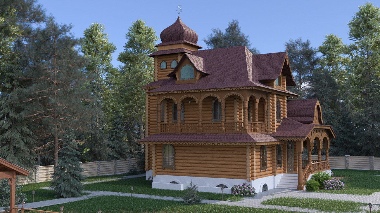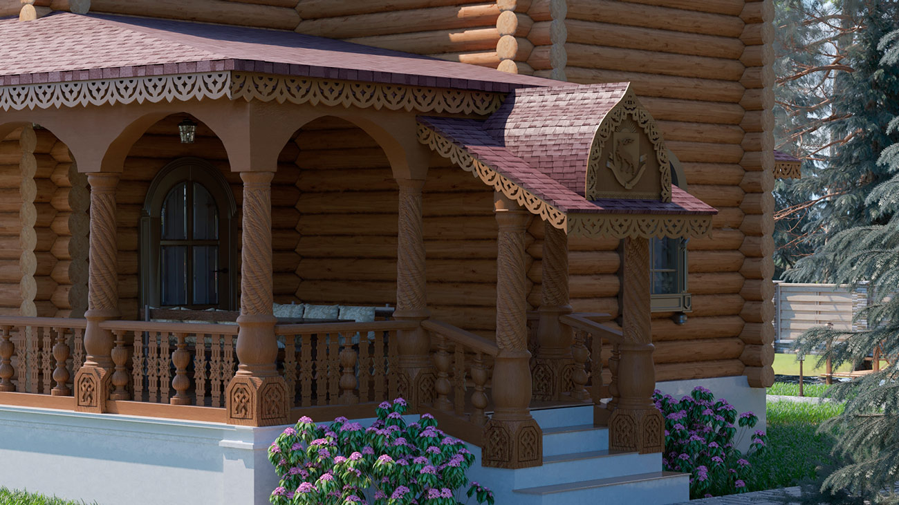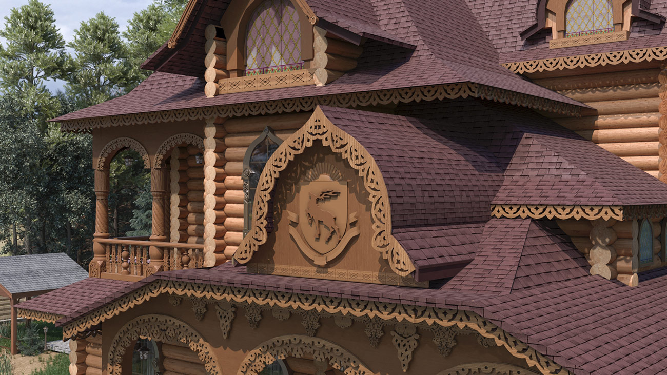 Использование форм, характерных для русской архитектуры, современная стилизация народного орнамента в домовой резьбе, обширная галерея (гульбище), акцент на крыльце здания, увенчанного семейным гербом, создают особую красоту этого проекта.