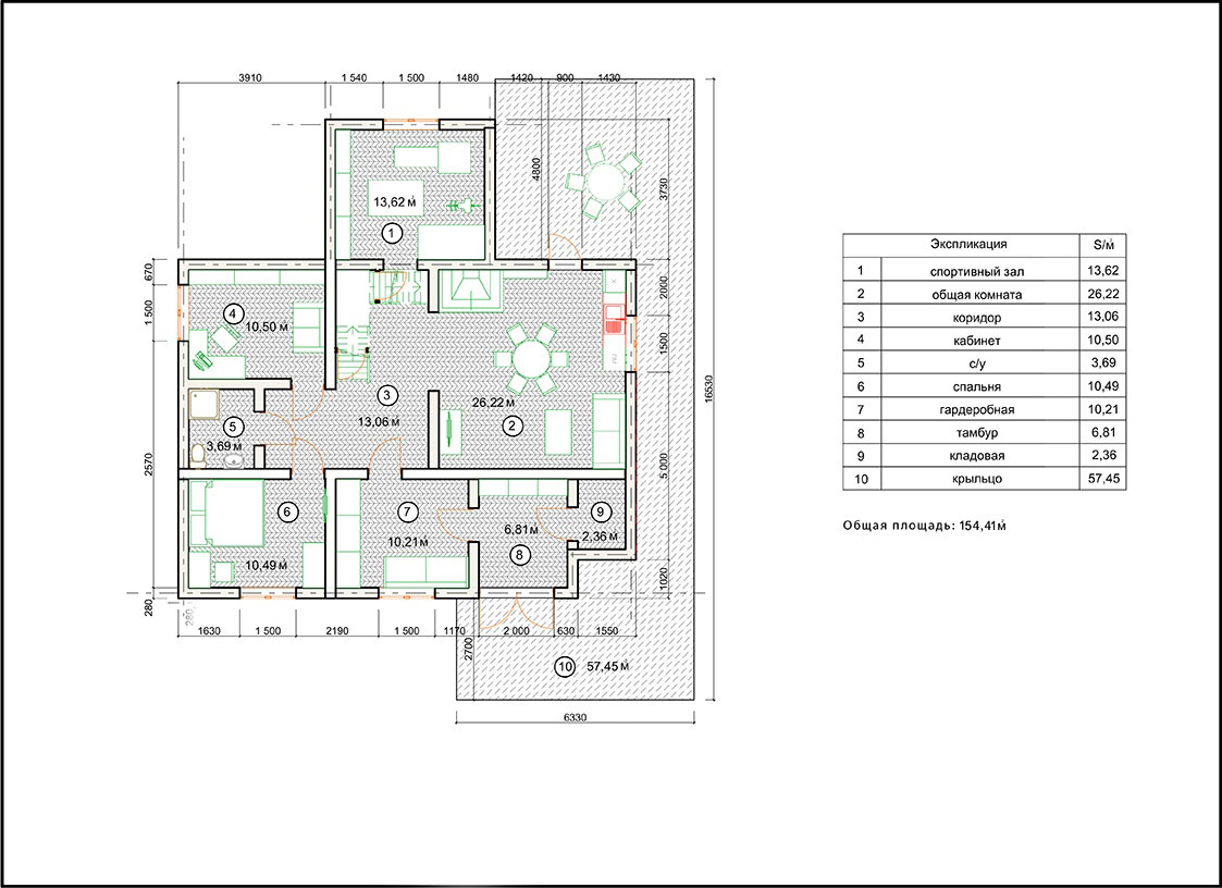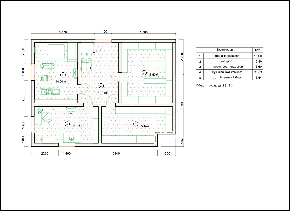 На первом этаже запроектированы: тамбур, кладовая, гардеробная, общая комната, спальня, кабинет, сан узел спорт зал, лестница.