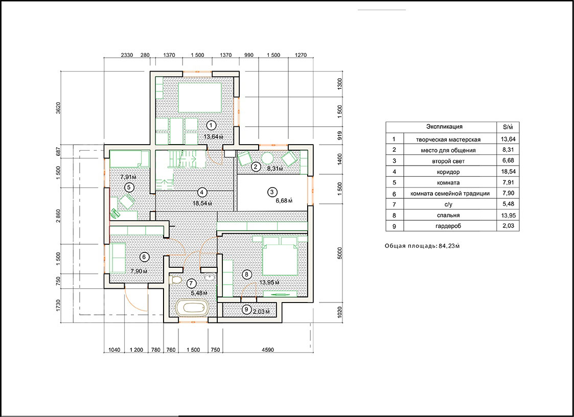 На втором этаже запроектированы лестница, творческая мастерская, 2 спальни, комната семейной традиции, сан узел, гардероб.