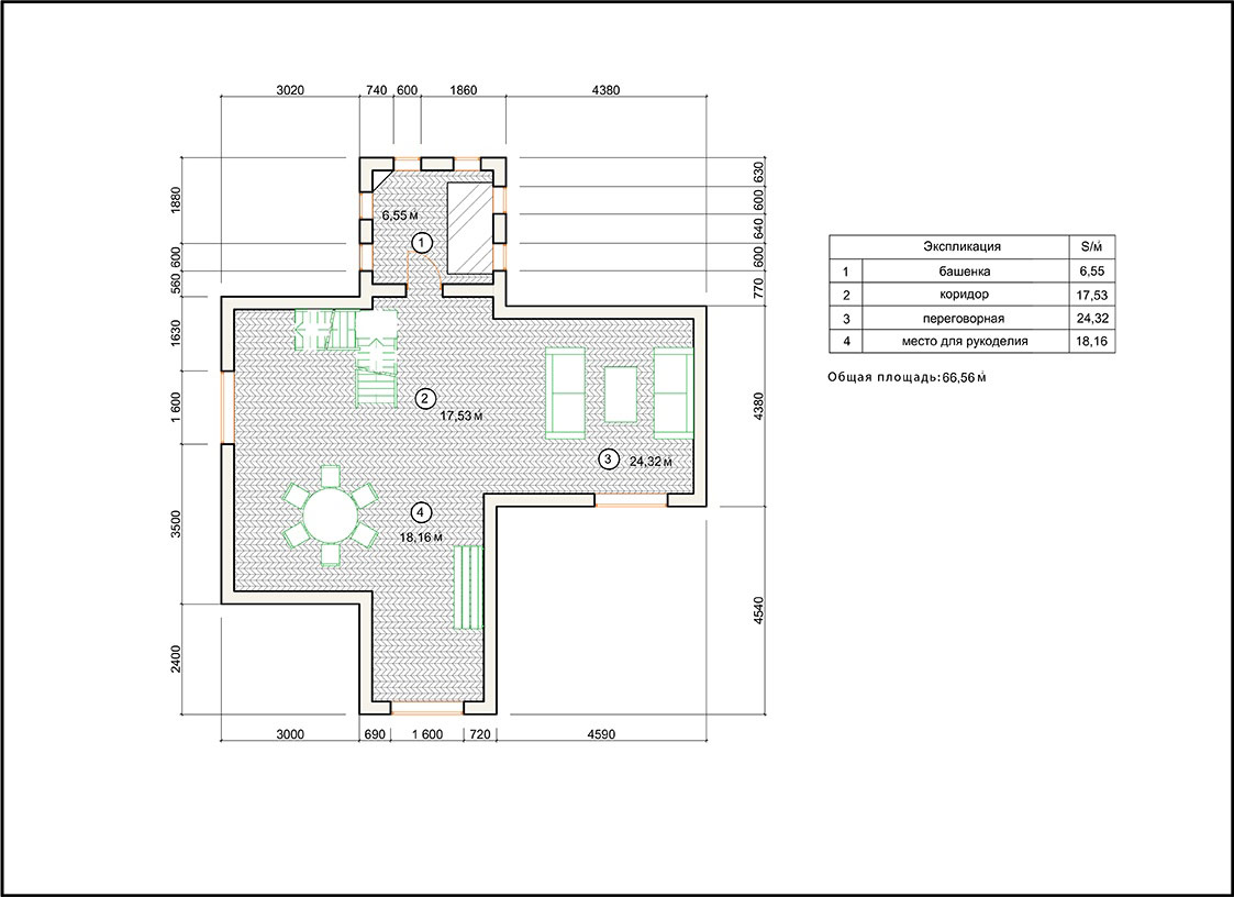 В мансарде запроектированы лестница, комната для уединения, переговорная и место для рукоделия.