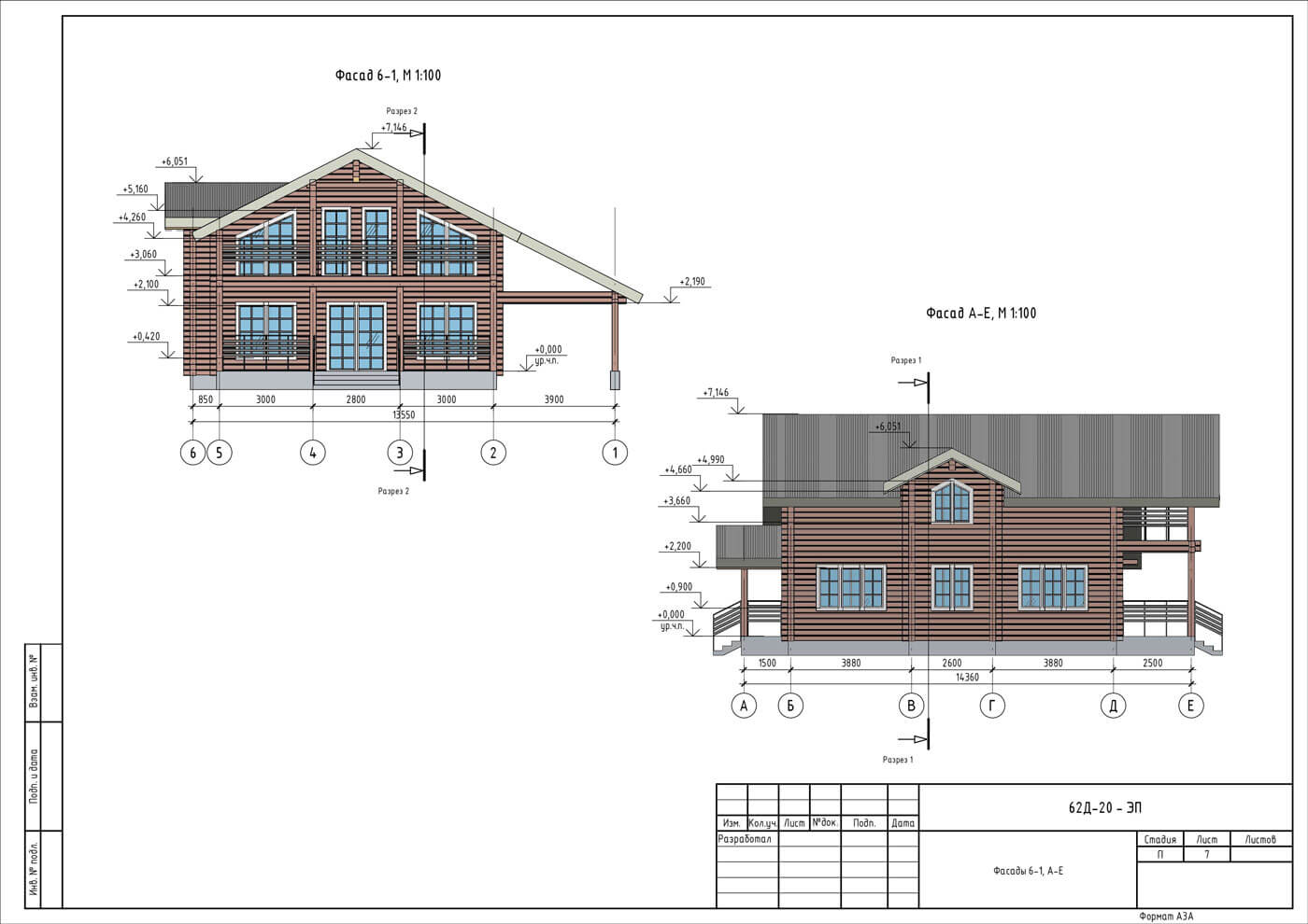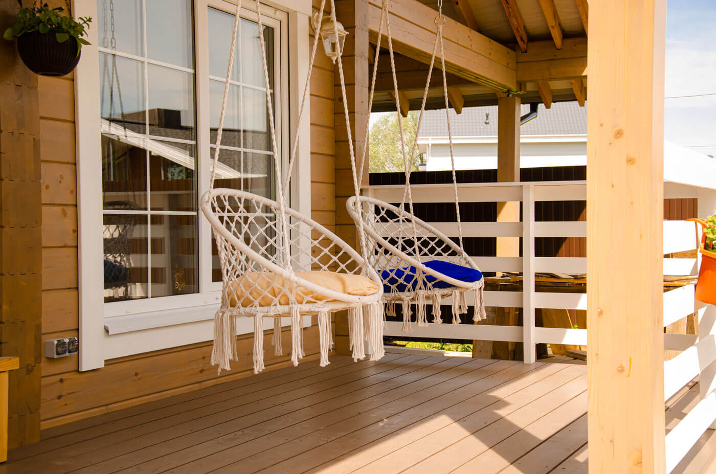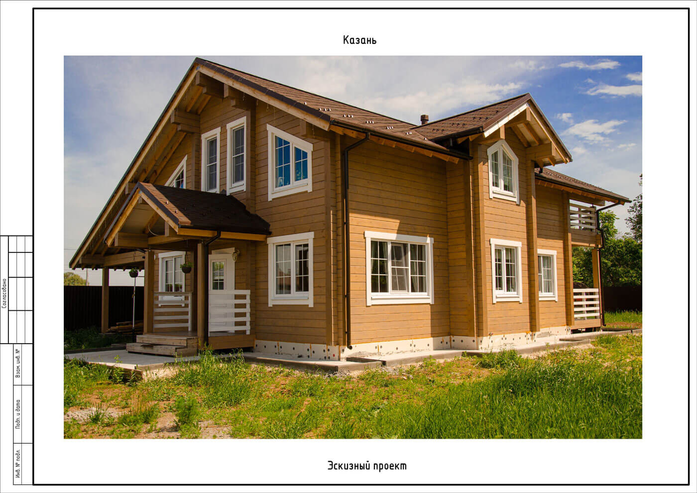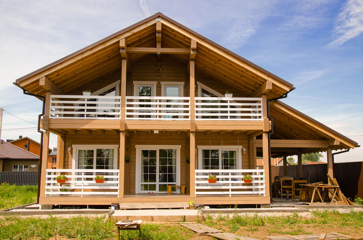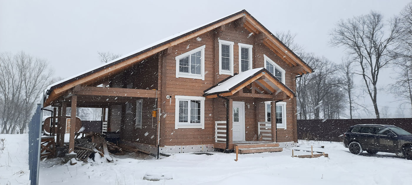 Архитектура дома отсылает к классическому для клееного бруса финскому стилю. Двускатная крыша, выносы клееного бруса над террасой и балконом и окна с белыми наличниками придают дому особый шарм.