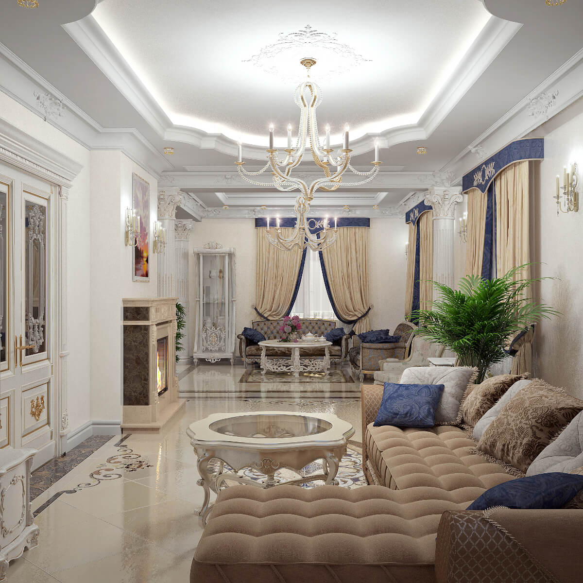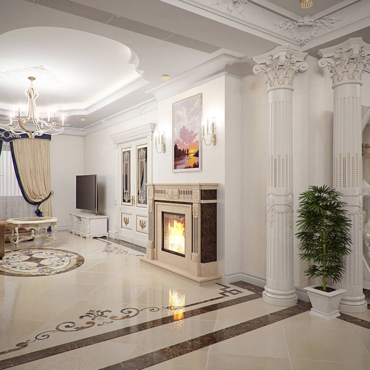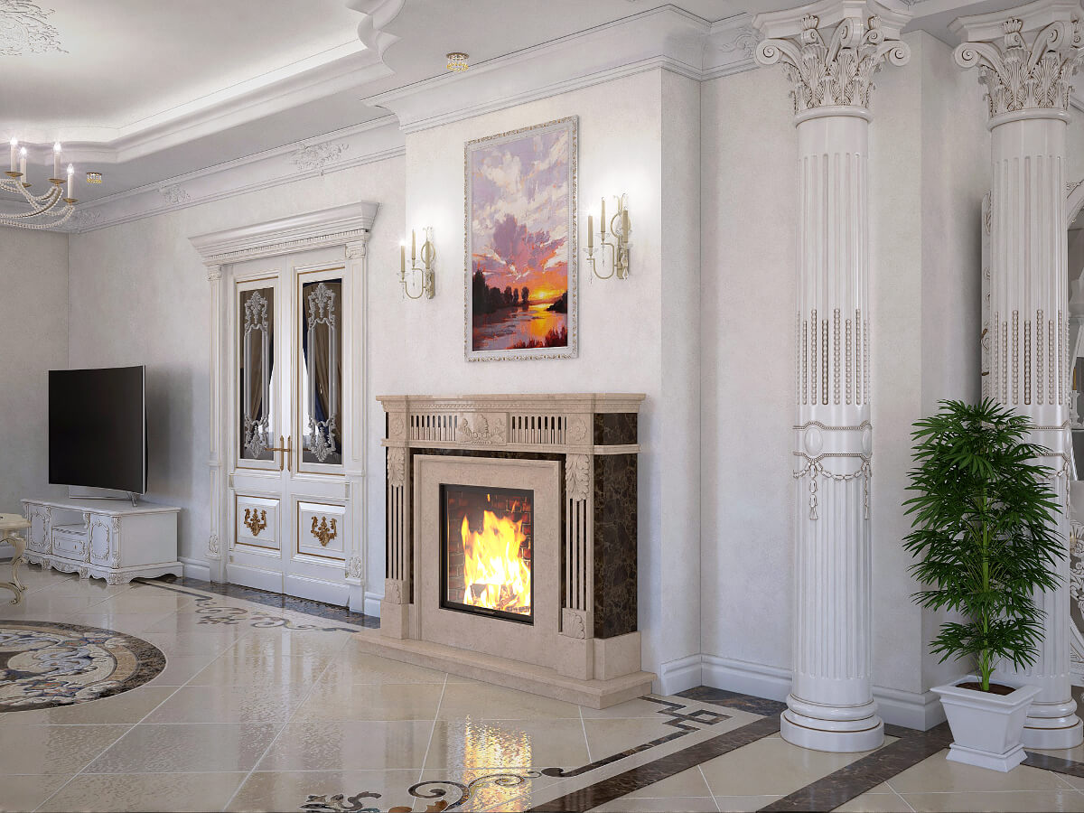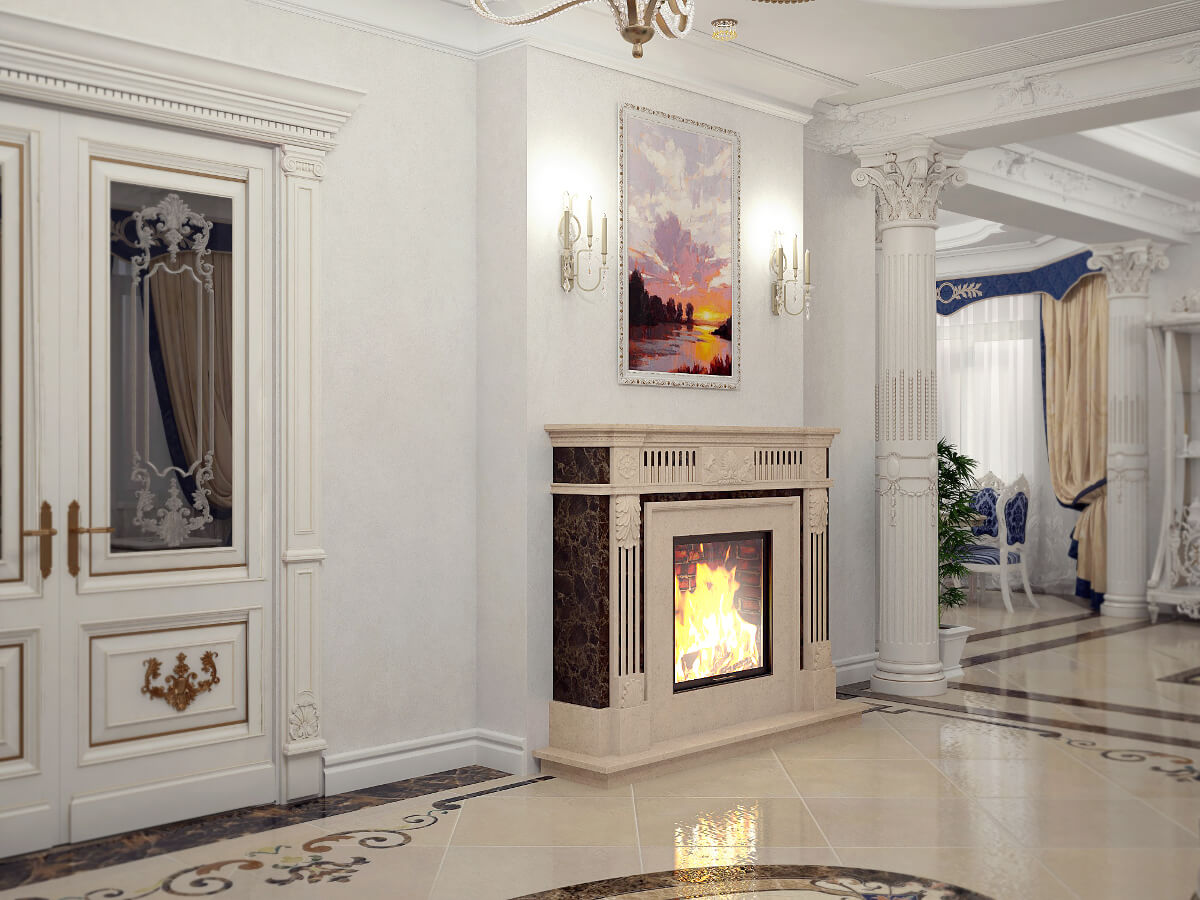 Центр гостиной занимает строгий, классический камин. Напротив камина расположены удобные кресла и кофейный столик.