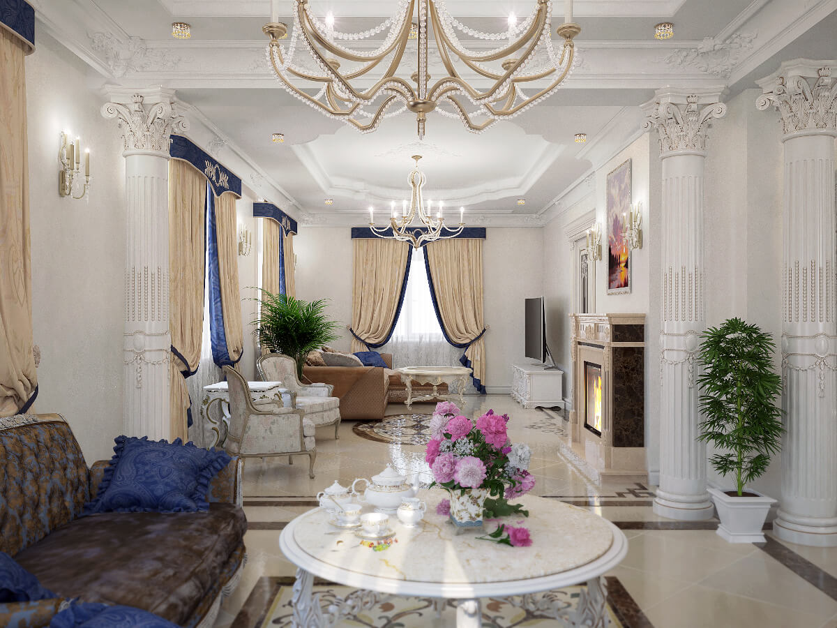 В просторном 3-этажном доме главенствует классика, для которой тщательно отбирались различные виды мрамора, декоративные элементы, коллекции мебели, аксессуары, дорогой текстиль. Особую роль в оформлении интерьеров играет и благородная цветовая гамма, сочетающая теплые и светлые оттенки, торжественную белизну и прозрачную голубизну.