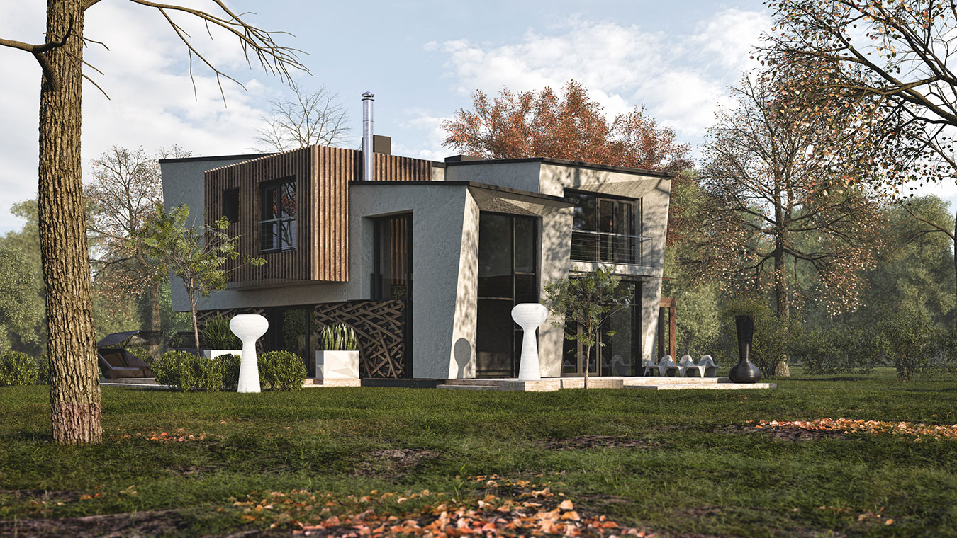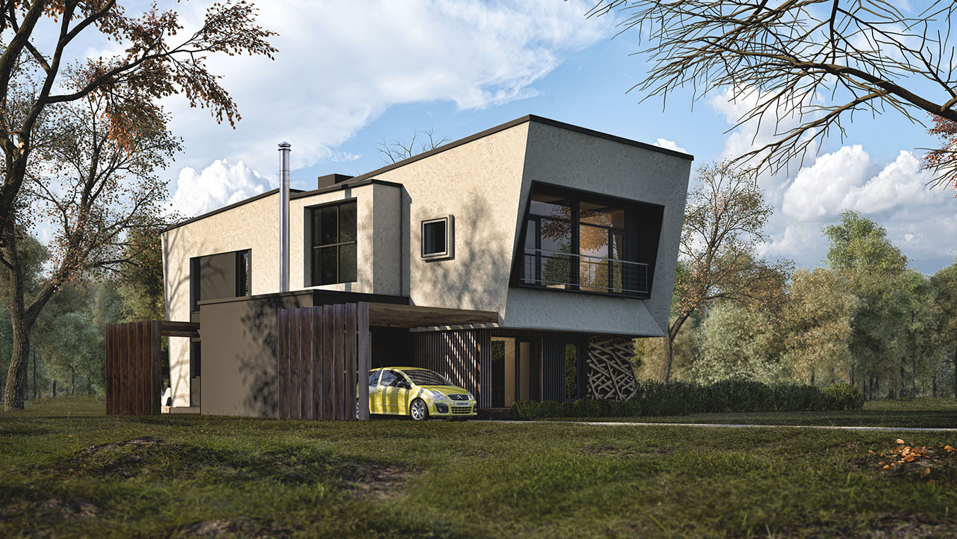 Главный фасад, выходящий на улицу, сформирован выдвинутым над входной группой объемом второго этажа. В этом объеме размещены две комнаты для детей. Малая площадь этих помещений компенсируется высотой потолка. Подъем высоты перекрытия над главным фасадом, динамичный наклон кровли — прием, позволяющий создать образ «Дома-корабля» и установить в детских двухъярусную мебель.